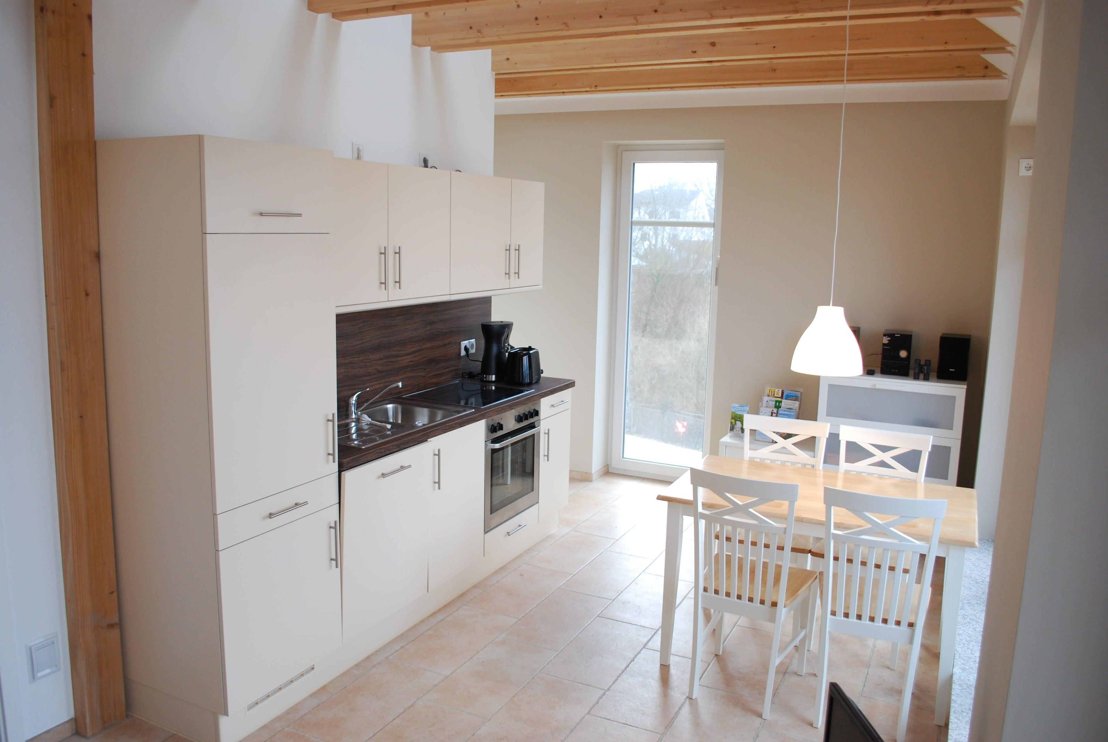 Die Wohnung verfügt über 2 separate Schlafzimmer: Eines davon, die sog. 'Kajüte', ist im Dachgeschoss und hauptsächlich für Kinder/Jugendliche ausgelegt. Die Kajüte ist über eine Leiter zu erreichen (nicht für Kinder unter 6 Jahren geeignet). Das Elternschlafzimmer verfügt über ein großes, komfortables Doppelbett. Das Bad ist ausgestattet mit Dusche, Badewanne u. Einbaumöbeln. Die Einbauküche verfügt neben neusten Elektrogeräten über eine Geschirrspülmaschine. Eine Sauna-Blockhütte (für bis zu 3 Personen) ist im Garten vorhanden, mit direktem Durchgang zur Ostsee. Im Garten können Kinder ein Trampolin nutzen. Die Wohnung liegt im 1. OG mit eigener Außentreppe. WLAN-Router mit DSL-Verbindung kostenfrei. Flat-TV mit DVD-Spieler. Hifi-Anlage mit iPod-/USB-Anschluss. Separate Waschmaschine zur kostenfreien Nutzung.