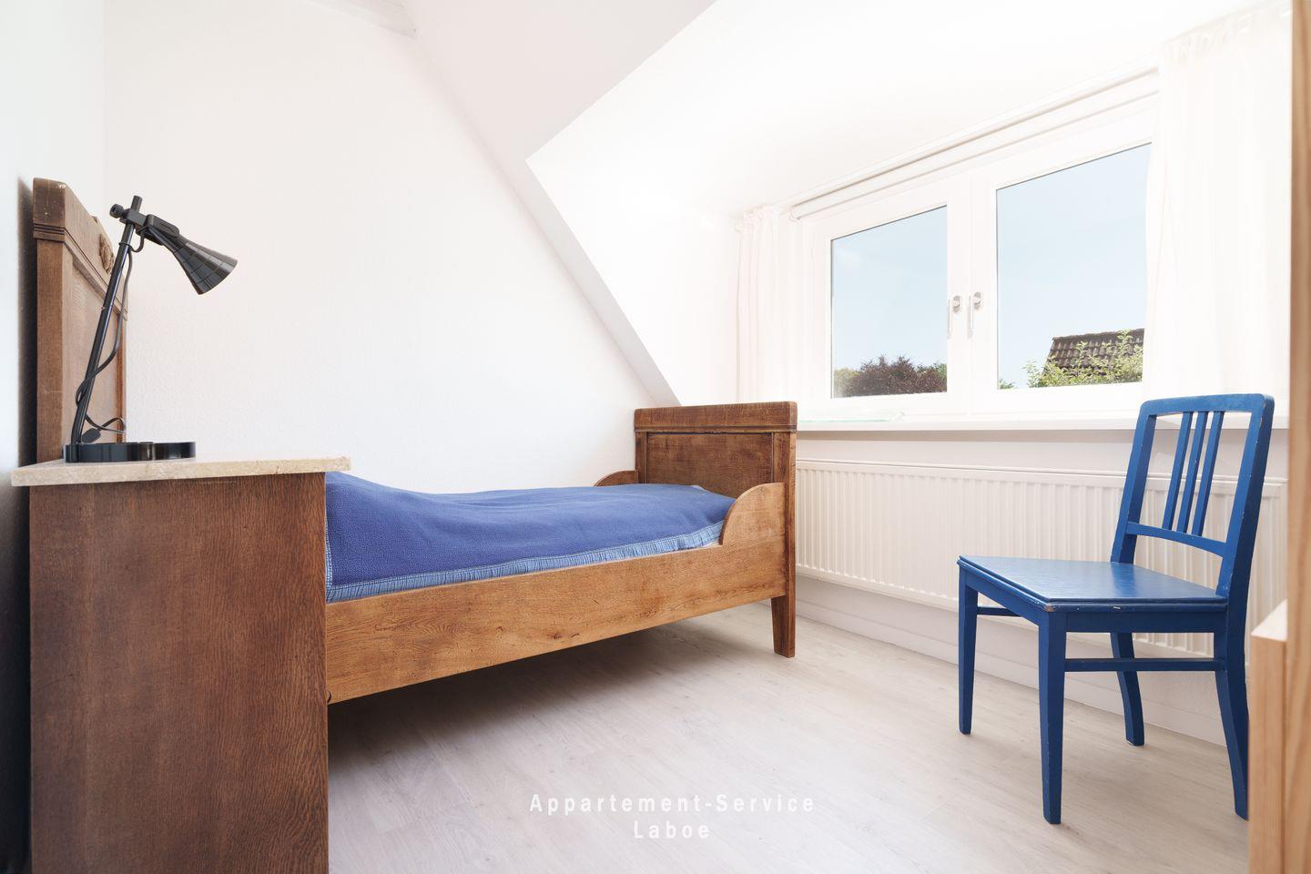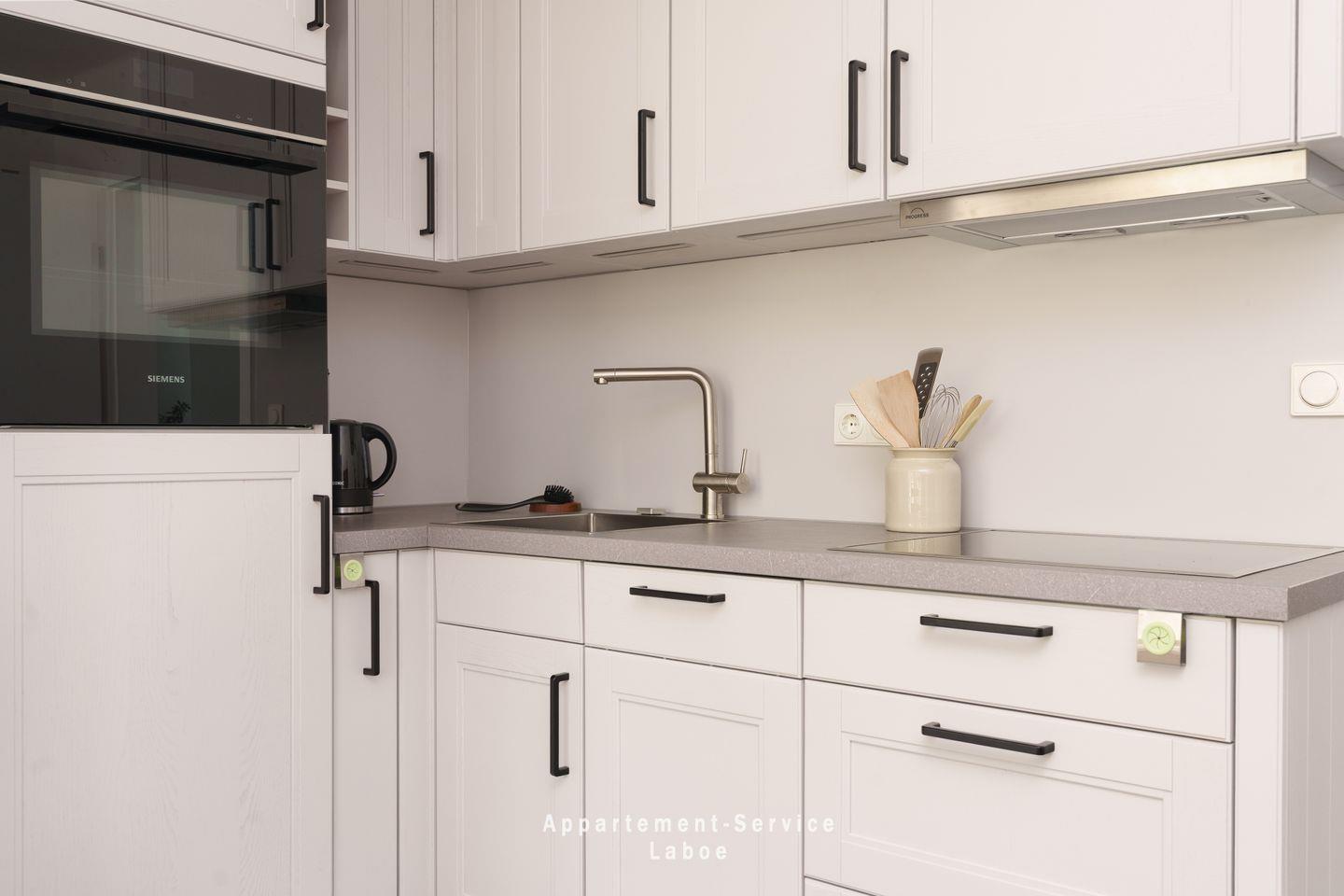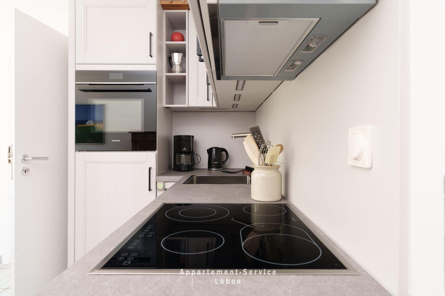 Die Küche ist großzügig geschnitten und bestens geeignet, um sich auch im Urlaub selbst zu versorgen. Hier wird gekocht, geschnippelt und gemeinsam gegessen. Durch die Fenster fällt der Blick in den kleinen Garten, der an warmen Tagen wie eine Verlängerung des Wohnzimmers wirkt. Auf der möblierten Terrasse kannst du morgens deinen Kaffee genießen und abends den Tag bei einem Glas Wein ausklingen lassen.