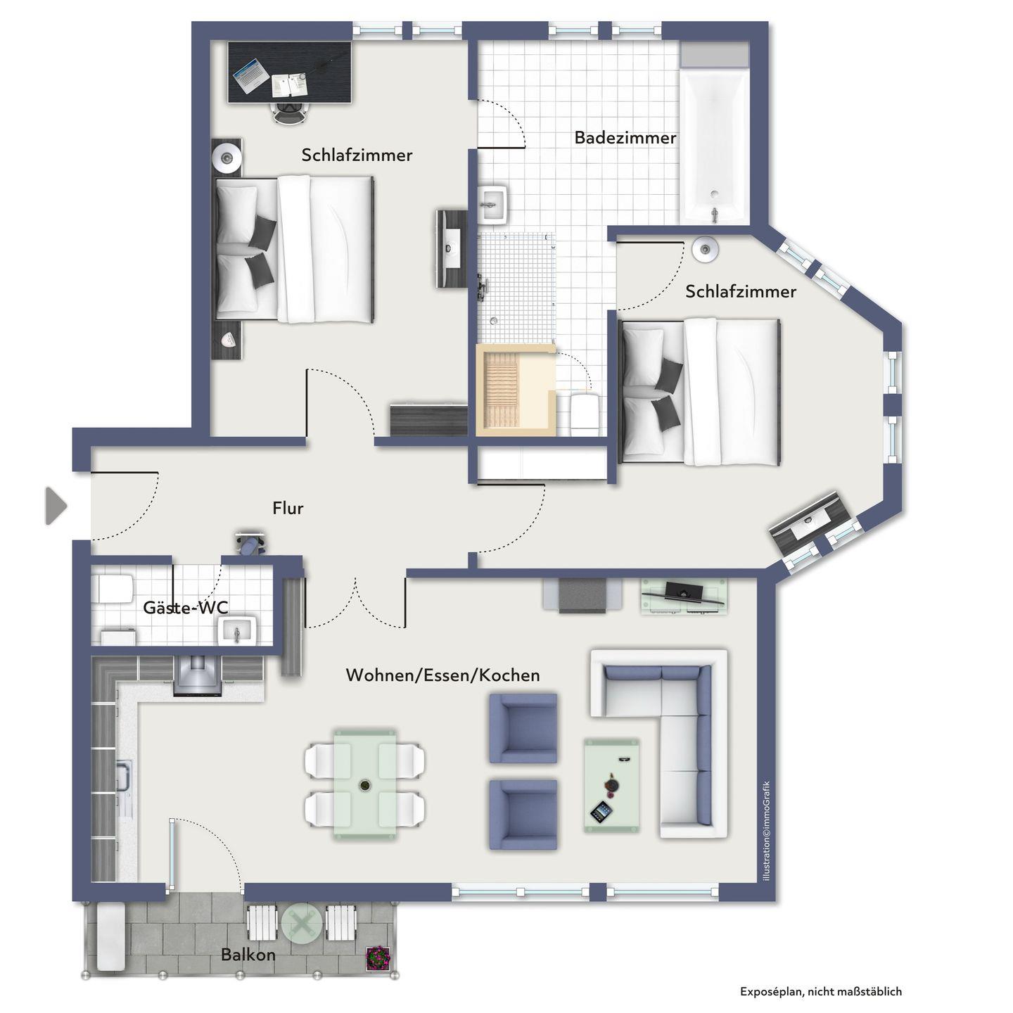 Ein Gäste- WC befindet sich gegenüber dem 2. Schlafzimmer im Eingangsbereich.