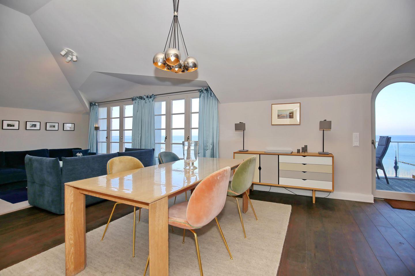 Der offen gestaltete und helle Essbereich der Ferienwohnung lädt Sie zu entspannten Mahlzeiten mit fantastischem Meerblick ein. Die exklusive Siematic - Küche ist Teil des Essbereiches und ist mit einem Geschirrspüler, einem Wein-Kühlschrank, einem Kühlschrank, einer Mikrowelle, einem Gefrierschrank sowie einem vierfachem Induktionskochfeld und einem Backofen voll ausgestattet. Selbstverständlich stehen ein Toaster, eine Nespresso-Maschine, eine Filterkaffeemaschine sowie ein Wasserkocher für Sie bereit.