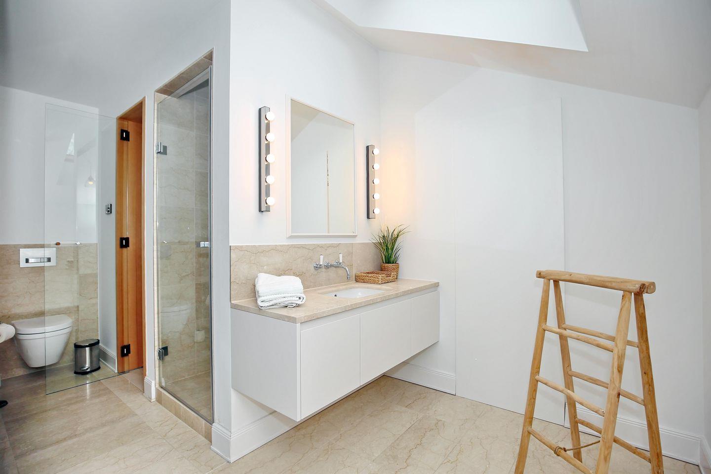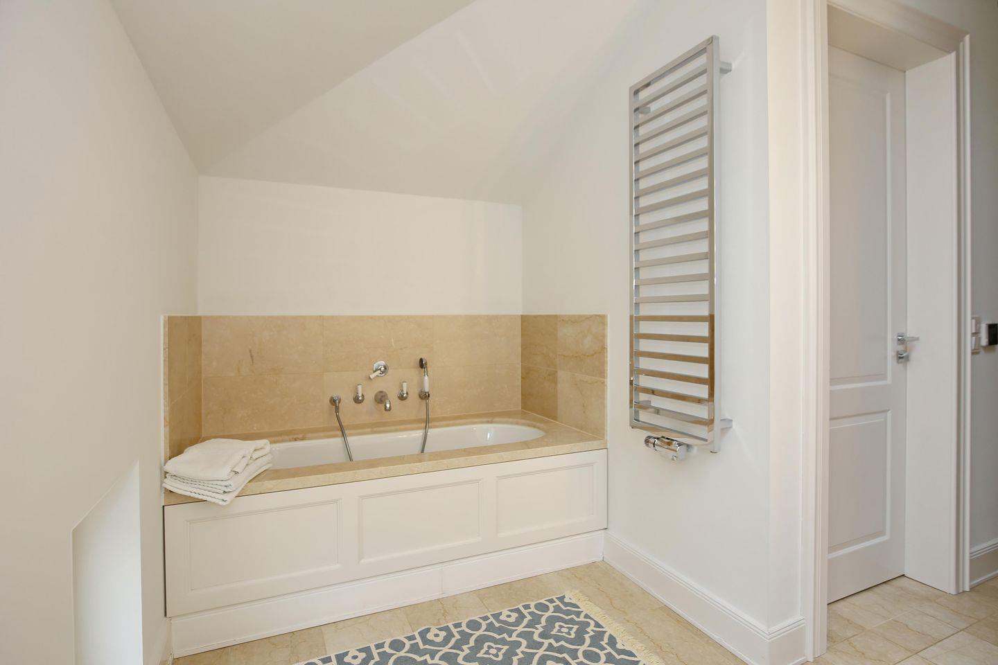Das große geflieste Bad mit Tageslicht verfügt über eine Badewanne, eine separate Dusche sowie ein WC und ist von beiden Schlafzimmern aus begehbar. Das moderne Bad ist mit einem großzügigen Waschtisch, der viel Stauraum für Ihre Waschutensilien bietet, und einem Föhn ausgestattet. Das Badezimmer verfügt sogar über eine eigene Sauna.