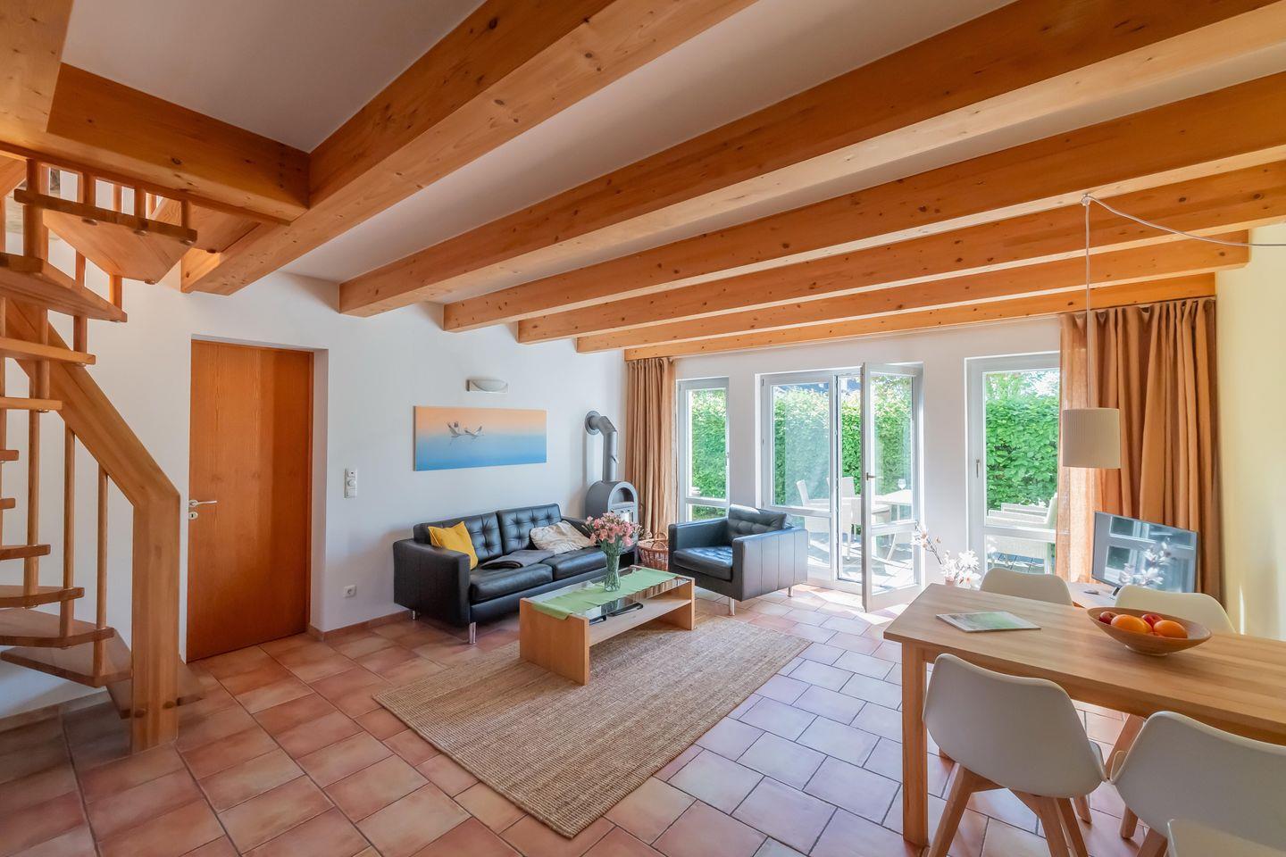Der offene Wohn- und Essbereich der Ferienwohnung verfügt über ein Sofa und einen separaten Sessel, einen Flachbild-TV, einen DVD-Player sowie ein Radio. Zusätzlich steht dir kostenloses WLAN zur Verfügung. Die gemütliche Essecke lädt zum Verweilen bei den gemeinsamen Mahlzeiten oder netten Spieleabenden ein. Der Kamin sorgt besonders in den kälteren Monaten für wohlige Wärme und Gemütlichkeit. Vom Wohnbereich aus hast du Zugang zur sonnenverwöhnten Terrasse.
