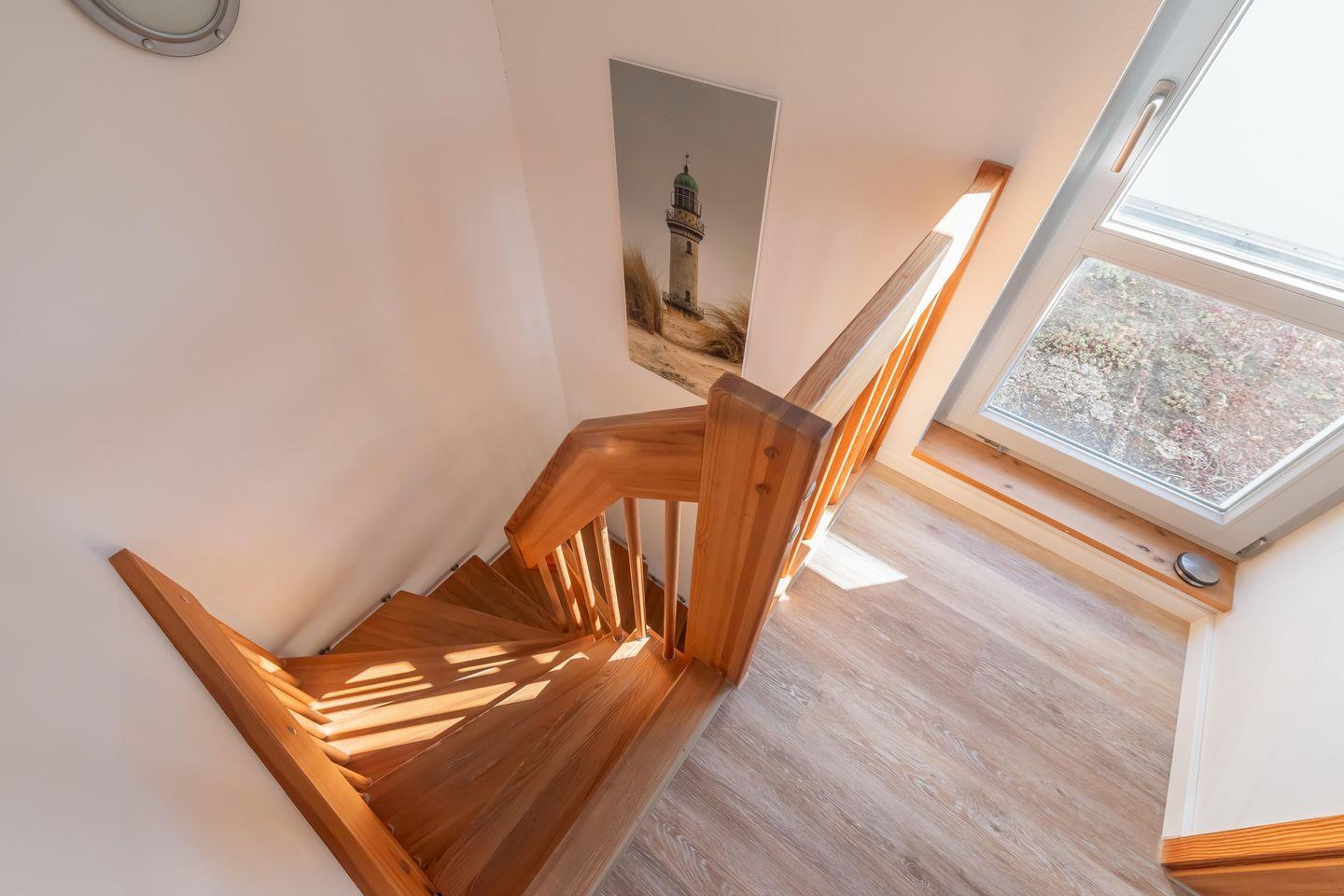 Zum Tageslichtbad im Untergeschoss mit Dusche und WC gehören ein Waschtisch mit beleuchtetem Spiegel sowie ein Föhn. Im gesamten Erdgeschoss sind Bodenfliesen mit Fußbodenheizung verlegt. Die Schlafräume im Obergeschoss sind mit einem Korkboden ausgestattet. In dieser Nichtraucherwohnung sind Haustiere nicht erlaubt.
