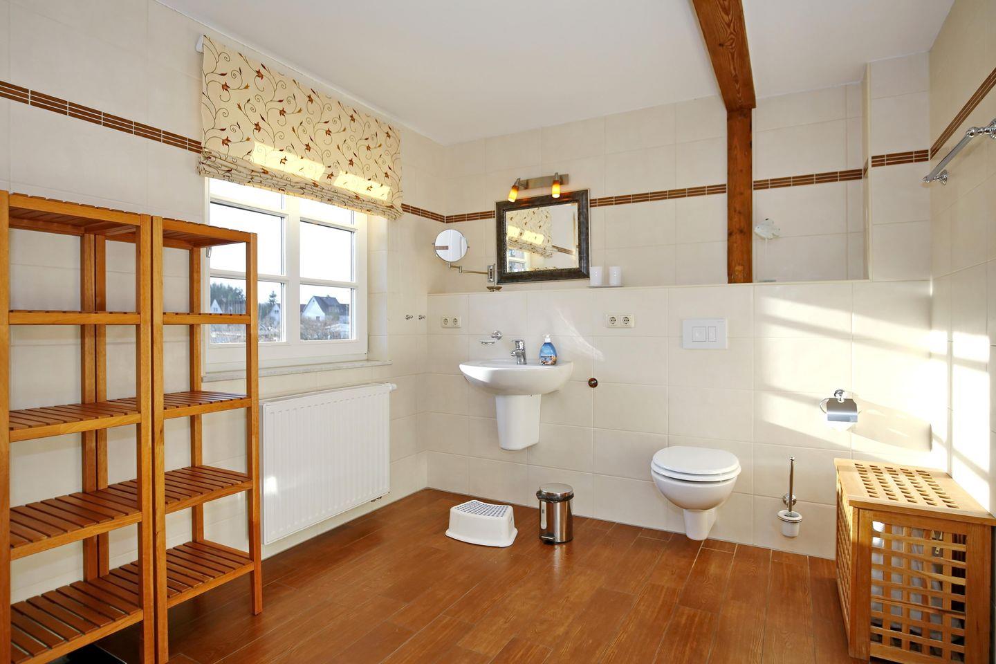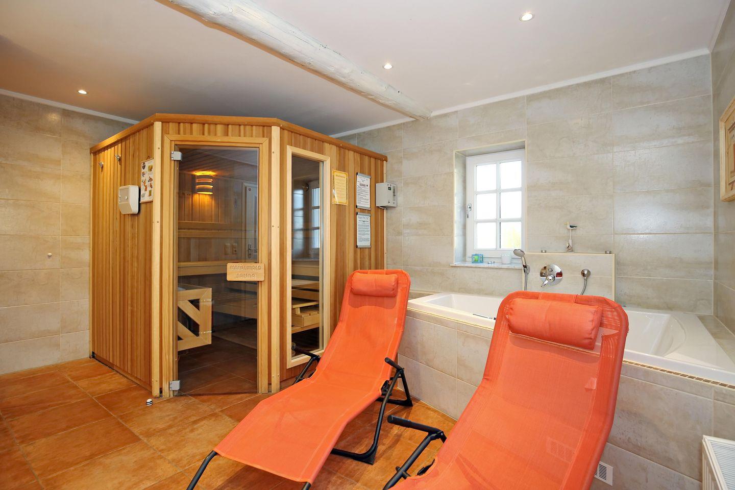 Das Badezimmer in der 1. Etage verfügt über eine Badewanne und eine Dusche. Im Erdgeschoss befindet sich ein Gäste-WC, eine Sauna (Gebühr 7,50 € für 2 h Laufzeit), eine Badewanne mit Whirlpool und eine Dusche.
