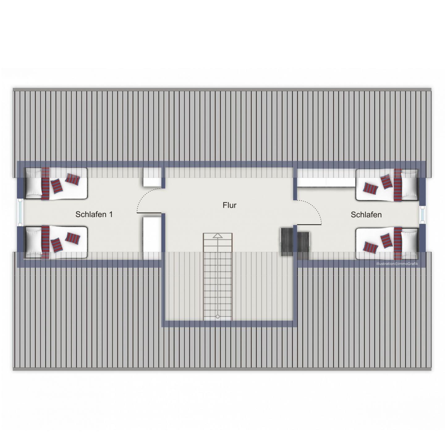 Die 2. Etage des Ferienhauses ist mit einem Flur und zwei Schlafzimmern mit je zwei Einzelbetten (2 x 90 cm x 200 cm) und einer Kommode ausgestattet.