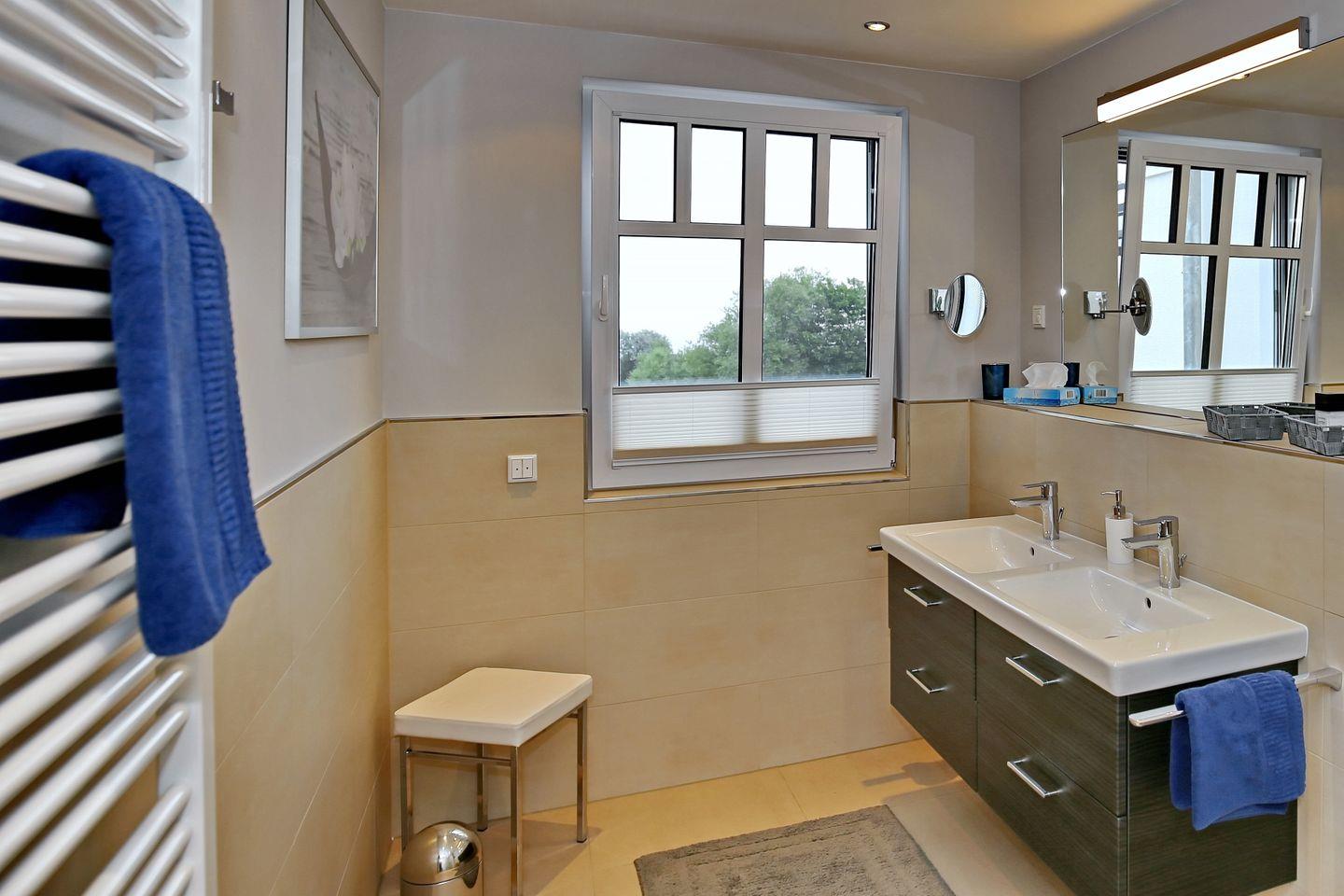 Das große Bad mit Tageslicht hat eine Wanne, eine große ebenerdige Dusche, einem WC und ist vom südlichen Schlafzimmer aus begehbar. Das Tageslichtbad mit Dusche und WC befindet sich zwischen dem Wohnbereich und dem Schlafzimmer. Die modernen Bäder sind mit großzügigen Waschtischen, die viel Stauraum für Ihre Waschutensilien bieten, und einem Föhn ausgestattet.