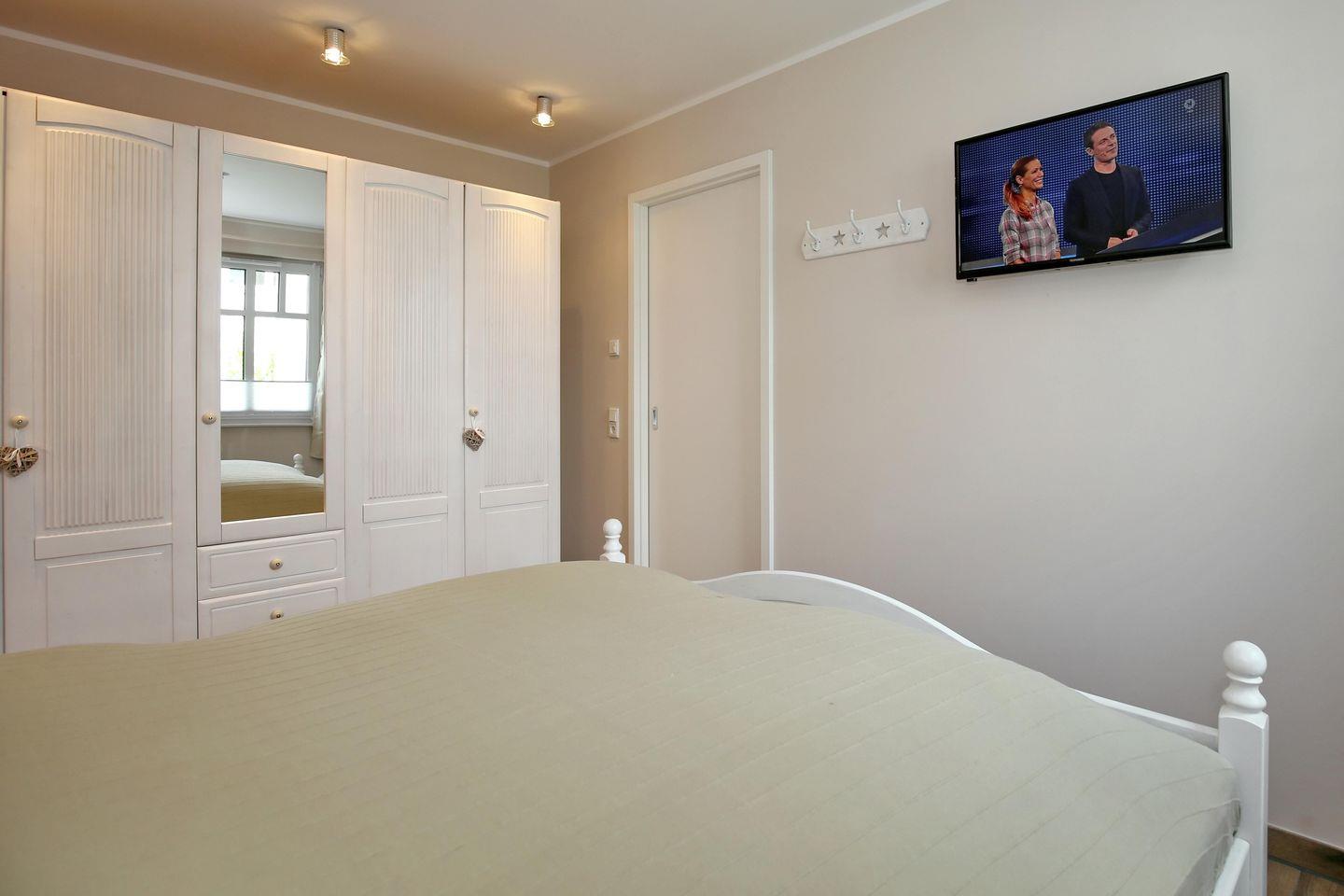 Im Schlafzimmer lädt ein komfortables Doppelbett mit zwei Matratzen (90 cm x 200 cm) zum erholsamen Schlaf ein. Der große Kleiderschrank bietet viel Stauraum für Ihre Sachen. Die Schlafcouch (160 x 200 cm) im Wohnbereich der Ferienwohnung wird mit wenigen Handgriffen zu einem bequemen Schlafplatz für 2 Personen. In den Schlafbereichen dienen Ihnen Plissees und Vorhänge als Sichtschutz und zum Verdunkeln.