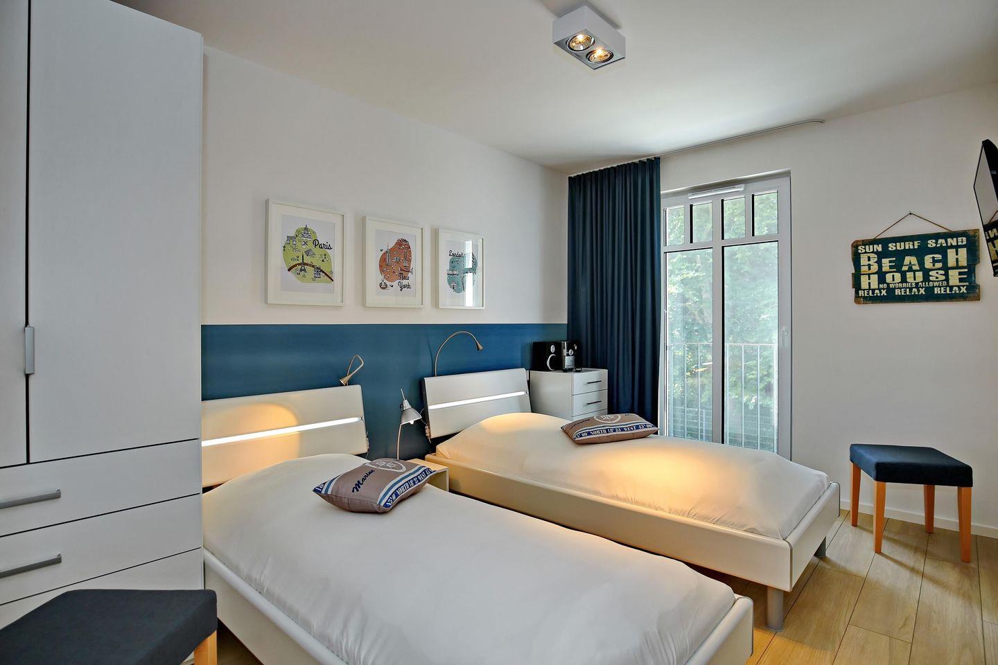 Im ersten Schlafzimmer lädt Sie ein komfortables Boxspringbett (180 x 200 cm) und im zweiten Schlafzimmer zwei Einzelbetten (90 x 200 cm) zur erholsamen Nachtruhe ein. Ein Flachbild-TV je Schlafzimmer ergänzt die Einrichtung. Für Ihr Urlaubsgepäck bietet Ihnen der große Kleiderschrank viel Stauraum. Vorhänge dienen Ihnen in den Schlafbereichen als Sichtschutz und zum Verdunkeln.