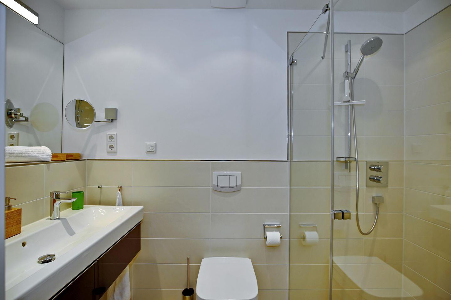 Das moderne Duschbad der Ferienwohnung verfügt über eine ebenerdige Dusche und einen Spiegelschrank. In der gesamten Wohnung sind Bodenfliesen in Holzoptik verlegt. In allen Wohnräumen sorgt die Fußbodenheizung für wohlige Wärme. Es handelt sich um eine Nichtraucher-Wohnung. Haustiere sind in dieser Wohnung nicht gestattet.