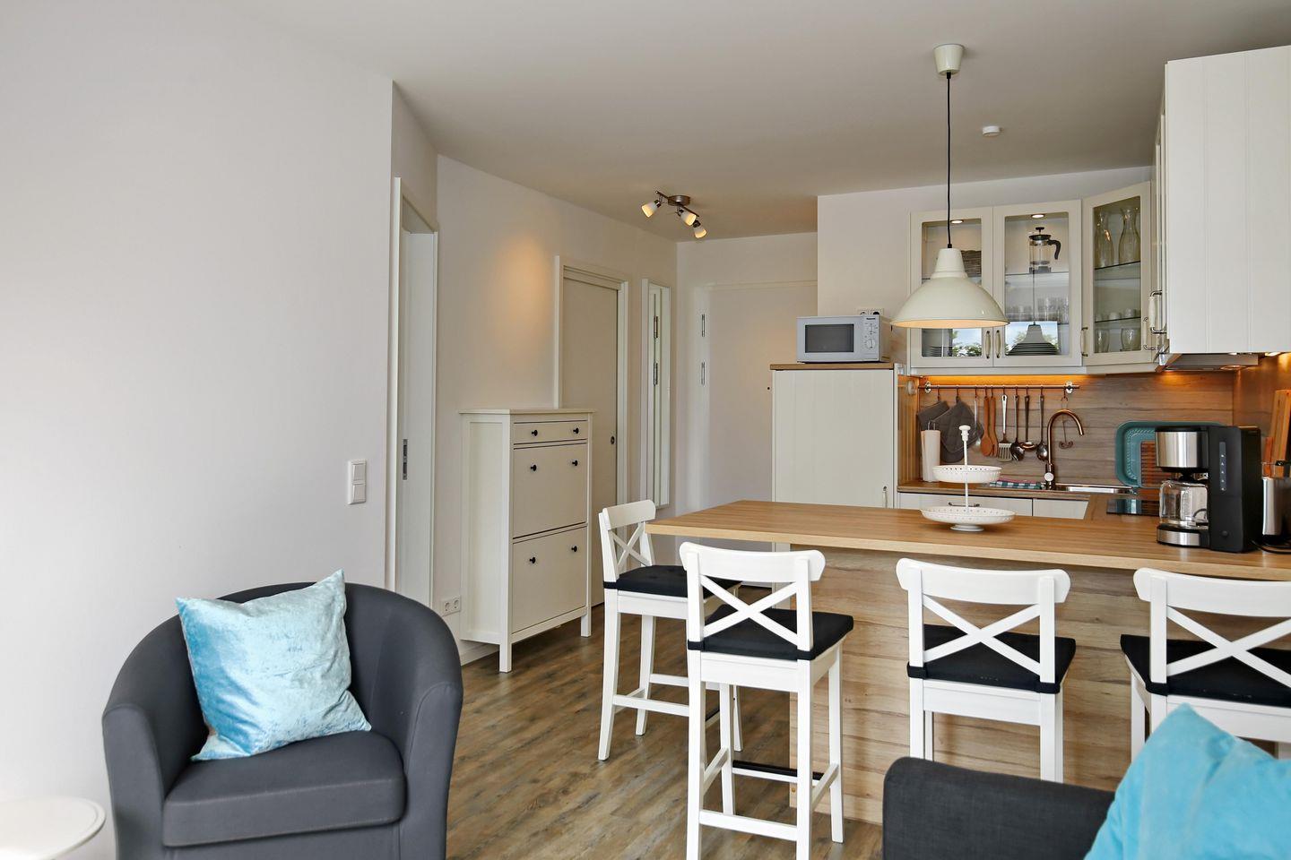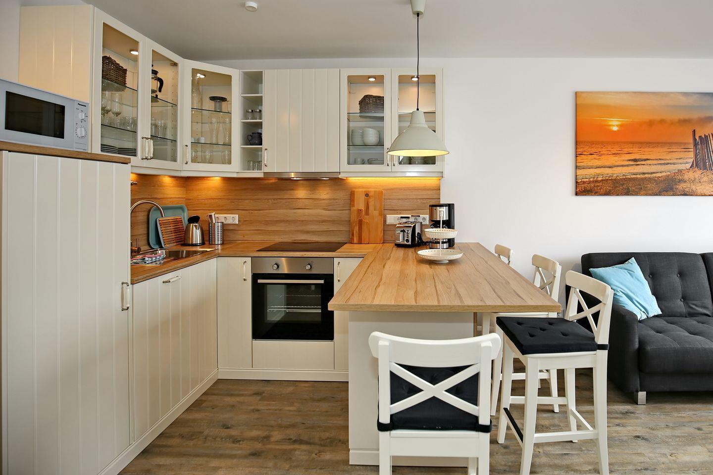 Die exklusive Küchenzeile ist unter anderem mit einem Geschirrspüler, einer Mikrowelle, einem vierfachem Cerankochfeld, einem Backofen sowie einem Kühlschrank mit Gefrierfach, einem Toaster, einem Wasserkocher und einer Filterkaffeemaschine voll ausgestattet.