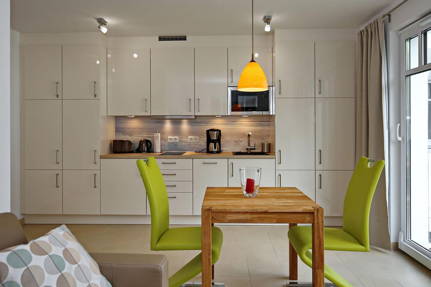 Die exklusive Küchenzeile ist unter anderem mit einem Geschirrspüler, einer Mikrowelle, einem zweifachen Cerankochfeld sowie einem Kühlschrank mit Gefrierfach, einem Toaster, einer Filterkaffeemaschine und einem Wasserkocher voll ausgestattet.