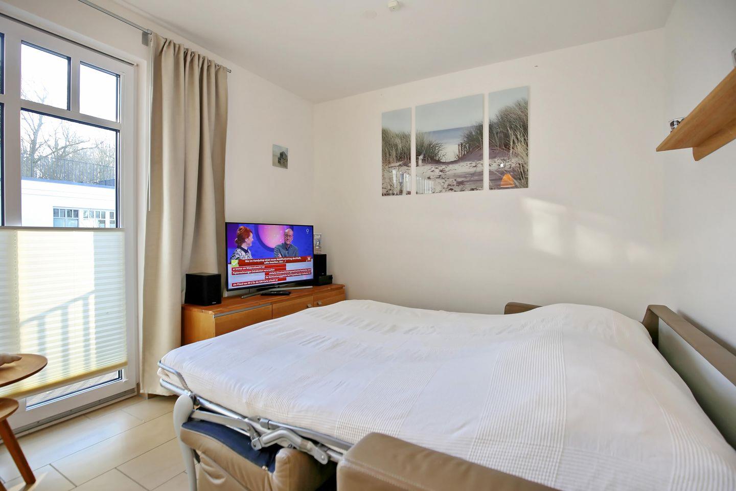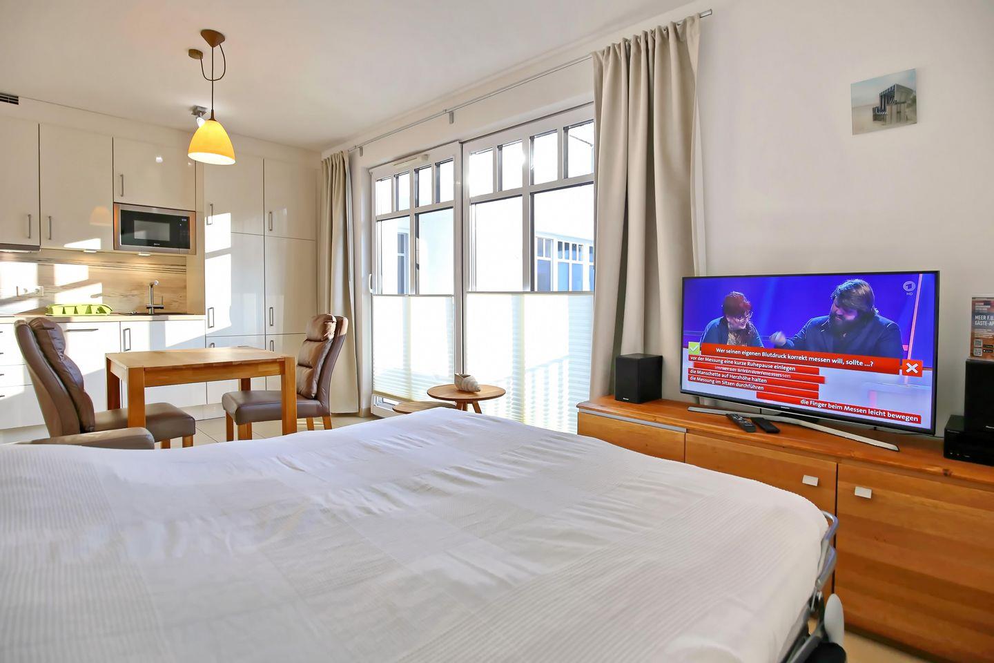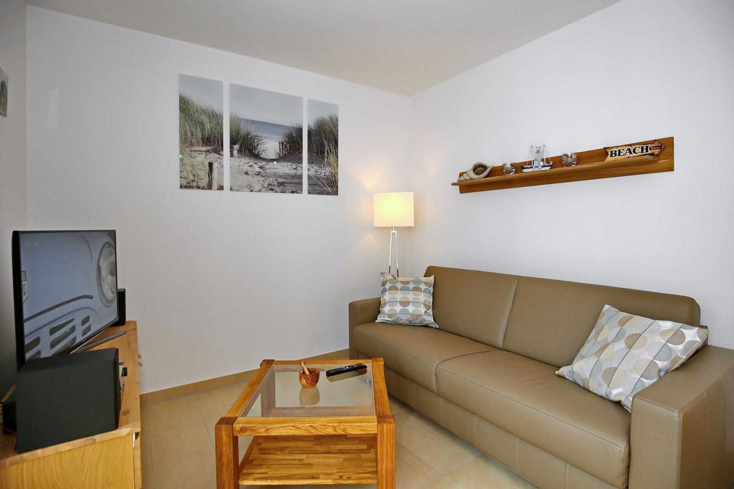 Im Wohnbereich der Ferienwohnung laden eine moderne Doppelschlafcouch (160 x 190 cm), ein Flatscreen-TV sowie ein Radio/CD-Player zu geselligen Abendstunden ein. Der gemütliche Essbereich ist im Wohnbereich integriert und gewährt Ihnen Platz für entspannte Mahlzeiten.