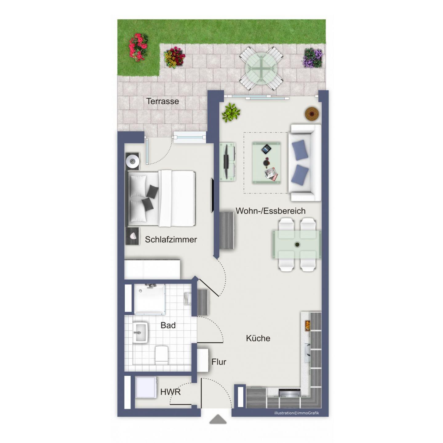 Die 56 m² große 2-Zimmer-Wohnung befindet sich im Erdgeschoss des Hauses. Erleben Sie entspannte Stunden auf der möblierten Nord-Terrasse. Die Ferienwohnung gliedert sich in einen Wohn- und Essbereich, eine Küchenzeile, ein Schlafzimmer sowie ein Duschbad und bietet bis zu 3 Personen Platz für einen erholsamen Urlaub an der Ostsee. Bis zum Strand sind es nur circa 50 Meter.