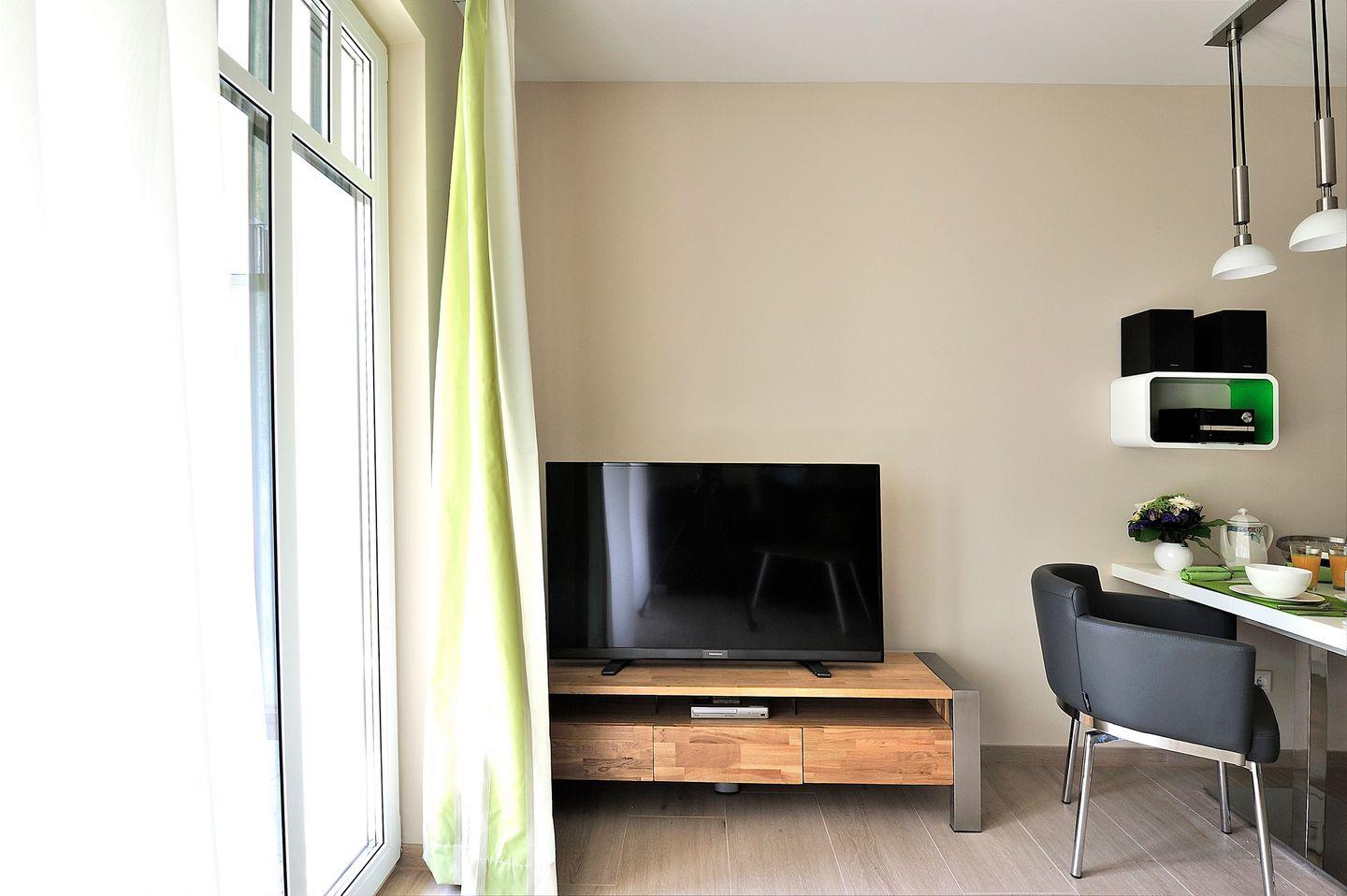 Im Wohnbereich der Ferienwohnung empfangen Sie eine bequeme Echtleder Couch, eine Stereoanlage und ein Flatscreen-TV für gemütliche Abende. Den WLAN-Zugang des Hauses können Sie kostenlos nutzen. Der integrierte Essbereich verspricht Ihnen entspannte Mahlzeiten.