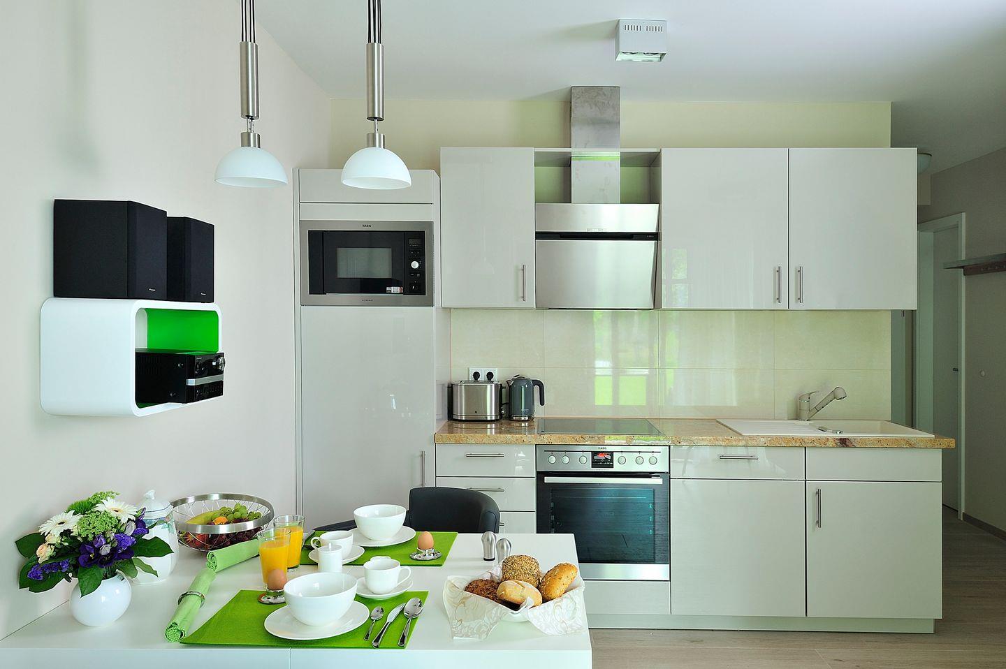 Die moderne Küchenzeile ist mit einem vierfachem Cerankochfeld, einem Backofen, einem Geschirrspüler, einer Mikrowelle sowie einem Kühlschrank mit Gefrierfach voll ausgestattet. Mit dem vorhandenen Toaster, der Kaffeemaschine und dem Wasserkocher finden Sie hier die alltäglichen Helfer für ein schönes Frühstück.