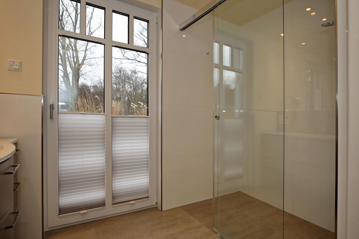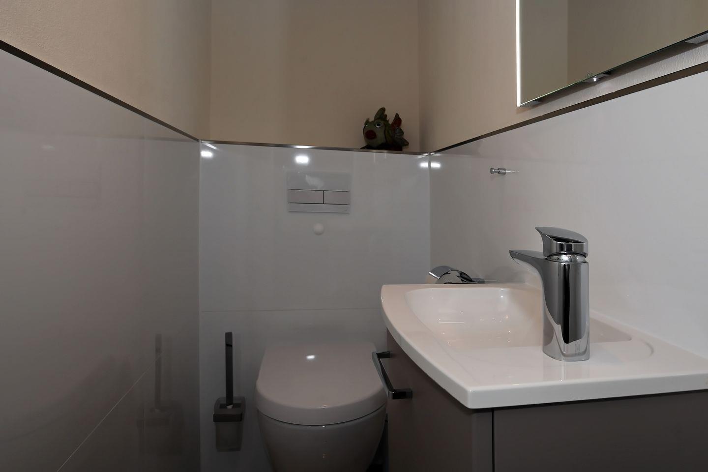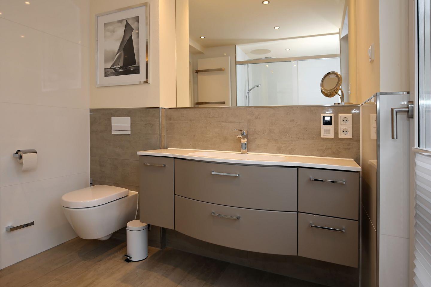 Das moderne Duschbad mit Tageslicht der Ferienwohnung verfügt über eine ebenerdige Dusche, einen Waschtisch mit Unterschrank und einem großen Spiegel. Ein Kosmetikspiegel und ein Fön sind selbstverständlich auch vorhanden. Zusätzlich steht ein separates Gäste-WC mit Waschtisch und Spiegel zur Verfügung.
