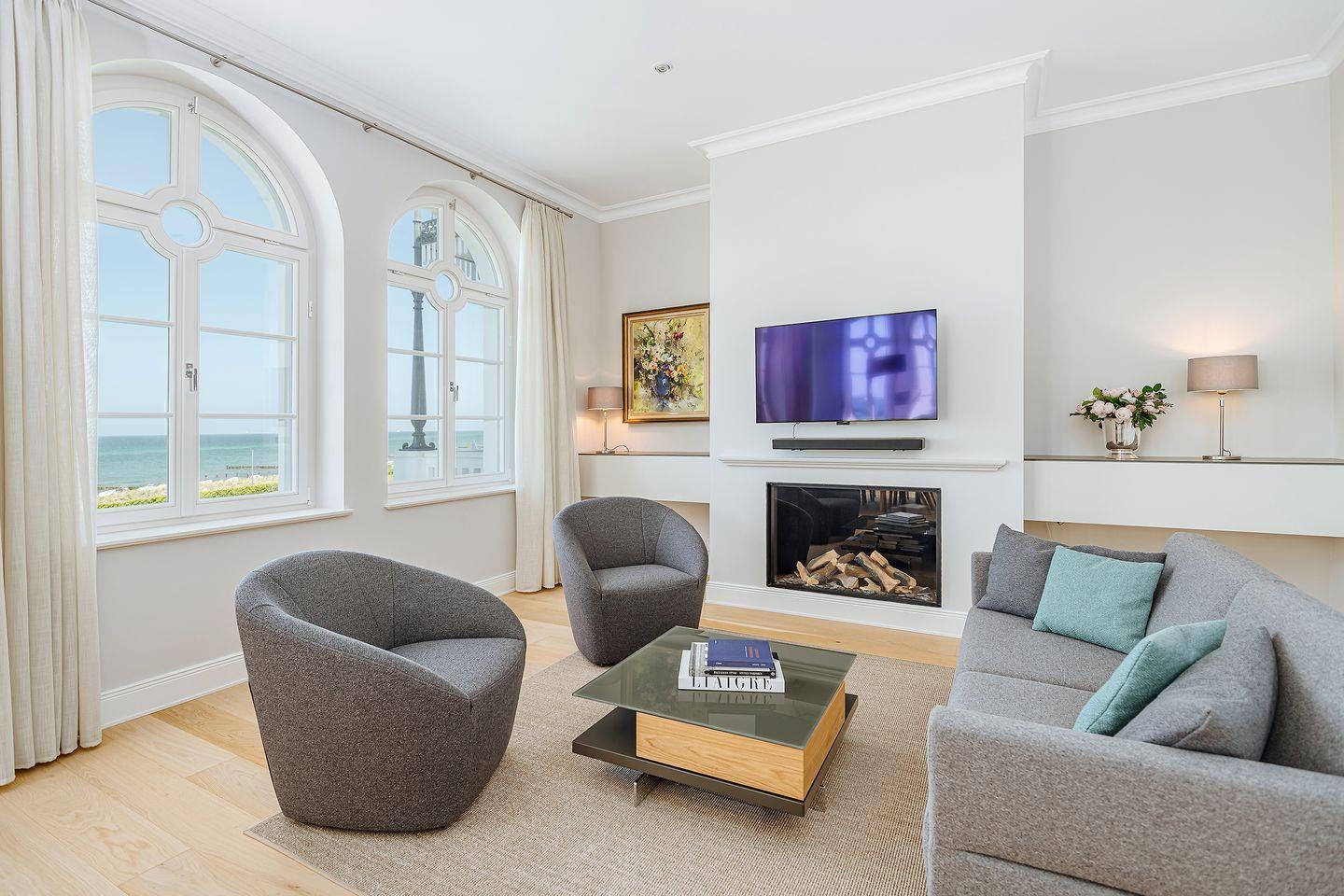 Das große Wohnzimmer mit Nord-Ausrichtung bietet einen atemberaubenden Blick zum Meer, zum Strand und zur Seebrücke. Genießen Sie in den Abendstunden einen Blick auf den wundervollen Sonnenuntergang. Die sehr hochwertige und exklusive Ausstattung mit Möbeln der Firmen Hülsta und Rolf Benz sorgen für eine stilvolle und gemütliche Atmosphäre. Für Ihre Unterhaltung stehen ein Flachbild-TV sowie eine LG Soundbar zur Verfügung. Der TV ist über Glasfaser-Internet nutzbar. Magenta-TV sowie Mediatheken einzelner TV-Sender können Sie genauso nutzen wie YouTube oder Ihre eigenen Internet-TV-Apps. Mit dem Angebot von Magenta TV steht Ihnen eine riesige Auswahl an nationalen und internationalen Sendern zur Verfügung. Ein Deko-Kamin, kostenfreies WLan und ein Festnetztelefon komplettieren die Ausstattung im Wohnbereich.
