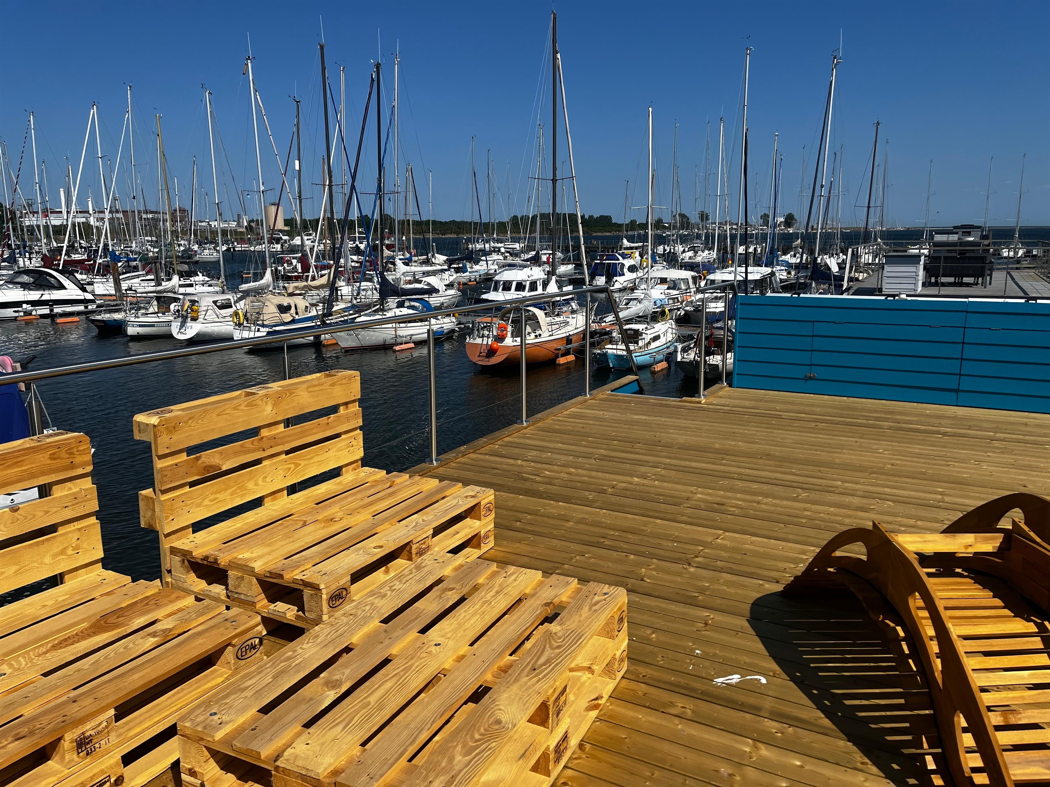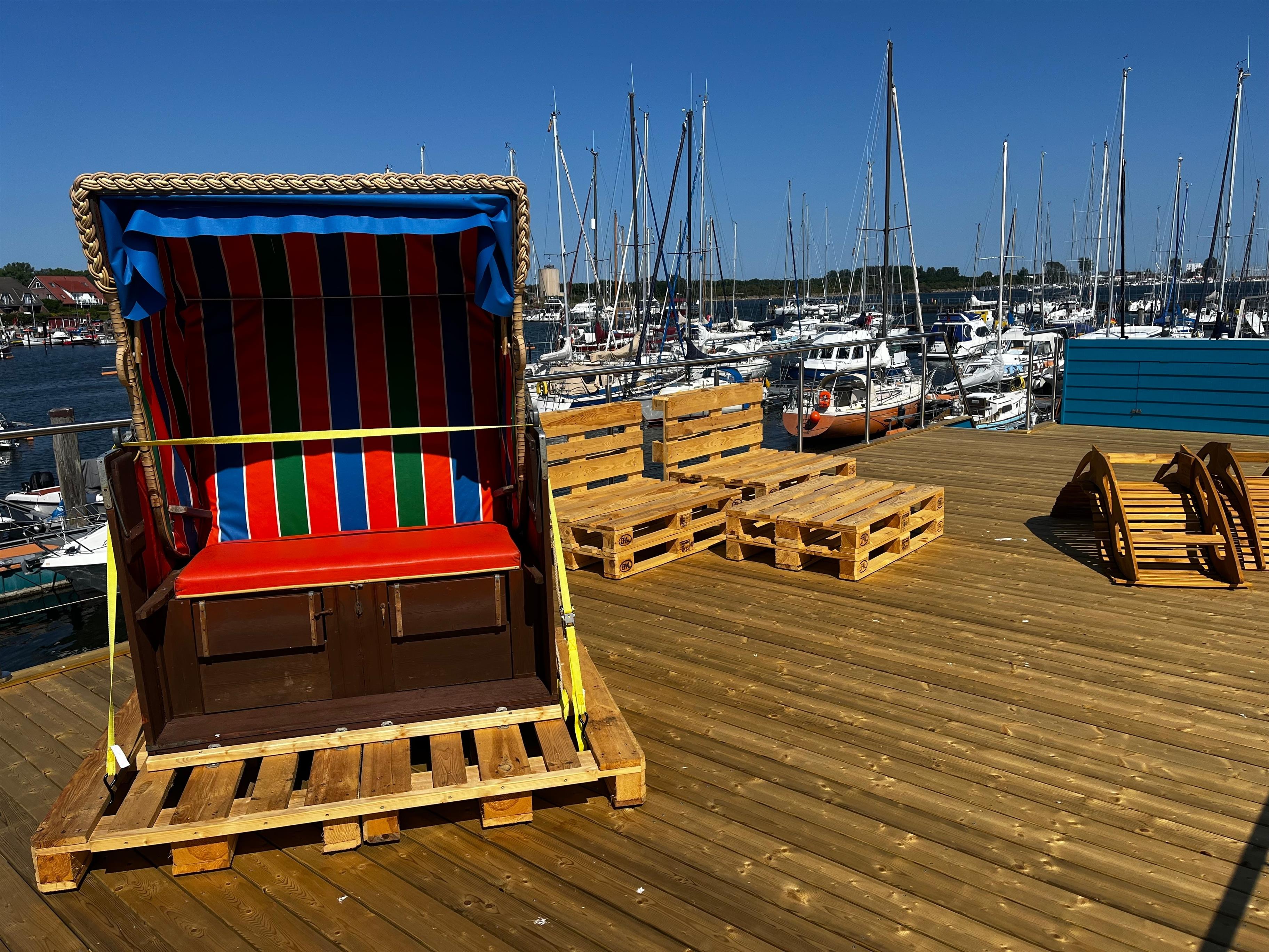 Das gesamte Oberdeck kann im vollen Umfang genutzt werden. Es steht ein eigener Strandkorb, gemütliche Palettenmöbel und Liegestühle zum Relaxen zur Verfügung. Hier haben Sie freien Blick auf das Meer und das Hafengeschehen.