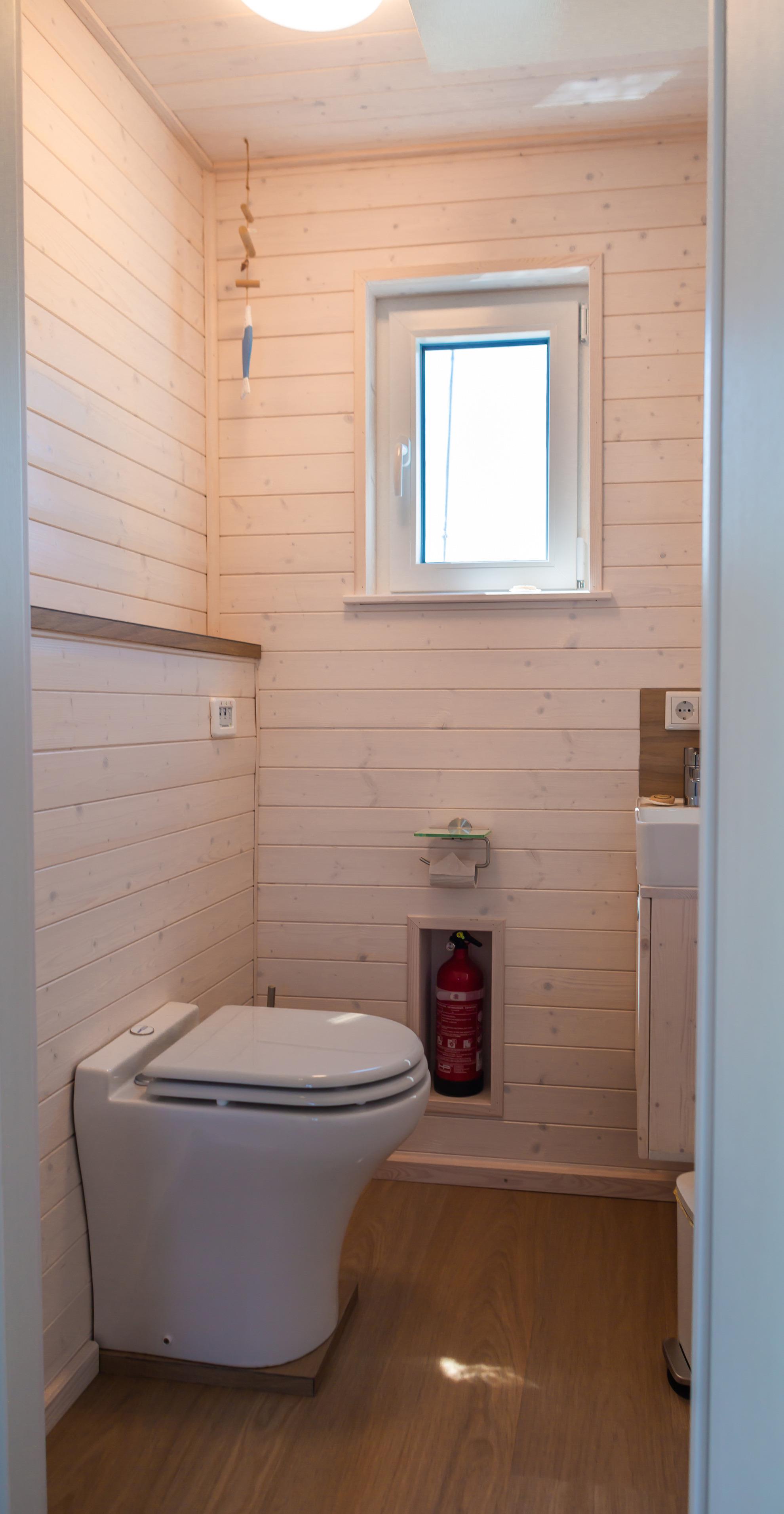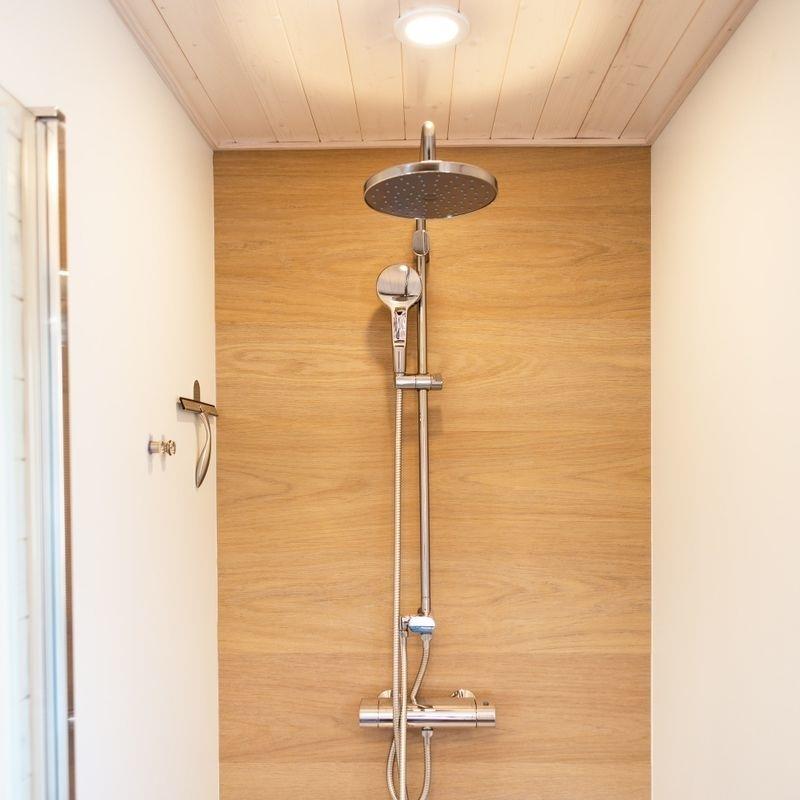 Das Dusch-Bad ist mit einer ebenerdigen Dusche sowie mit extra breiten Türen ausgestattet . Nur hier befindet sich die Fußbodenheizung. Das Hausboot verfügt über einen 60Liter Warmwasserboiler (warmes Wasser ist daher nur begrenzt nach Verbrauch verfügbar).