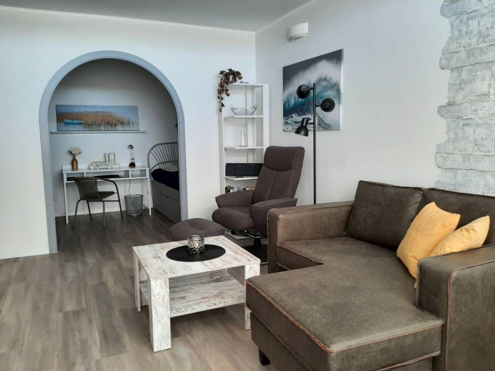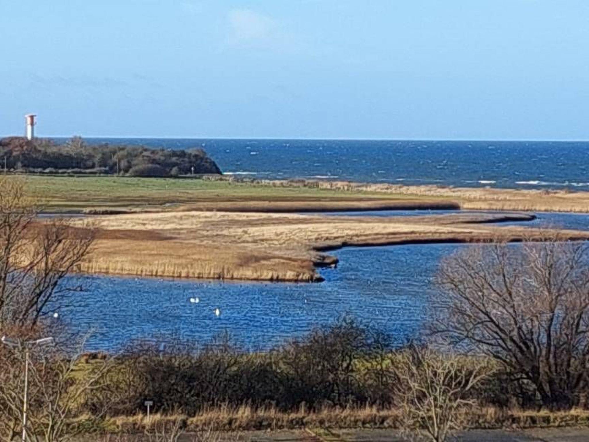 Lampen an den Wänden, WLAN, Heizung, Spielesammlung, Bücher, Große Fensterfront mit Plissee und Blick auf die Ostsee und Naturschutzgebiet, Tisch und 2 Ledersessel, Ausgang Balkon.