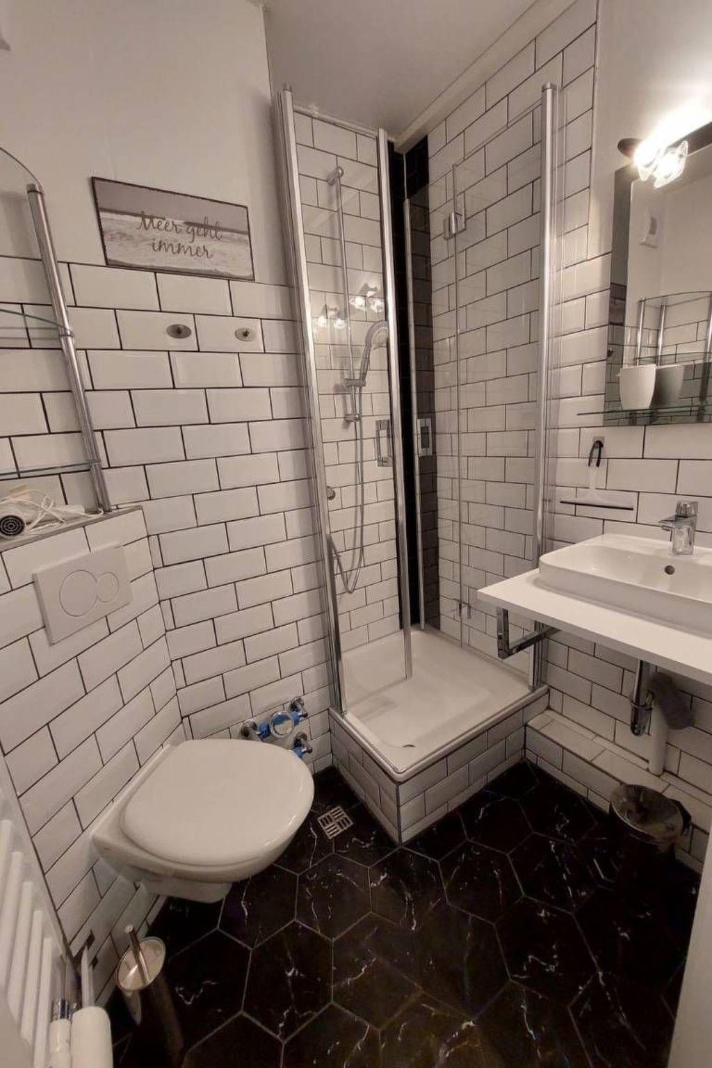 Heizung, Handtuchwärmer, WC, Waschbecken mit Konsolenhalterung incl. Handtuchhaltern, Duschkabine, Spiegel mit Ablage, Fön, Kosmetikspiegel, Warmwasser.