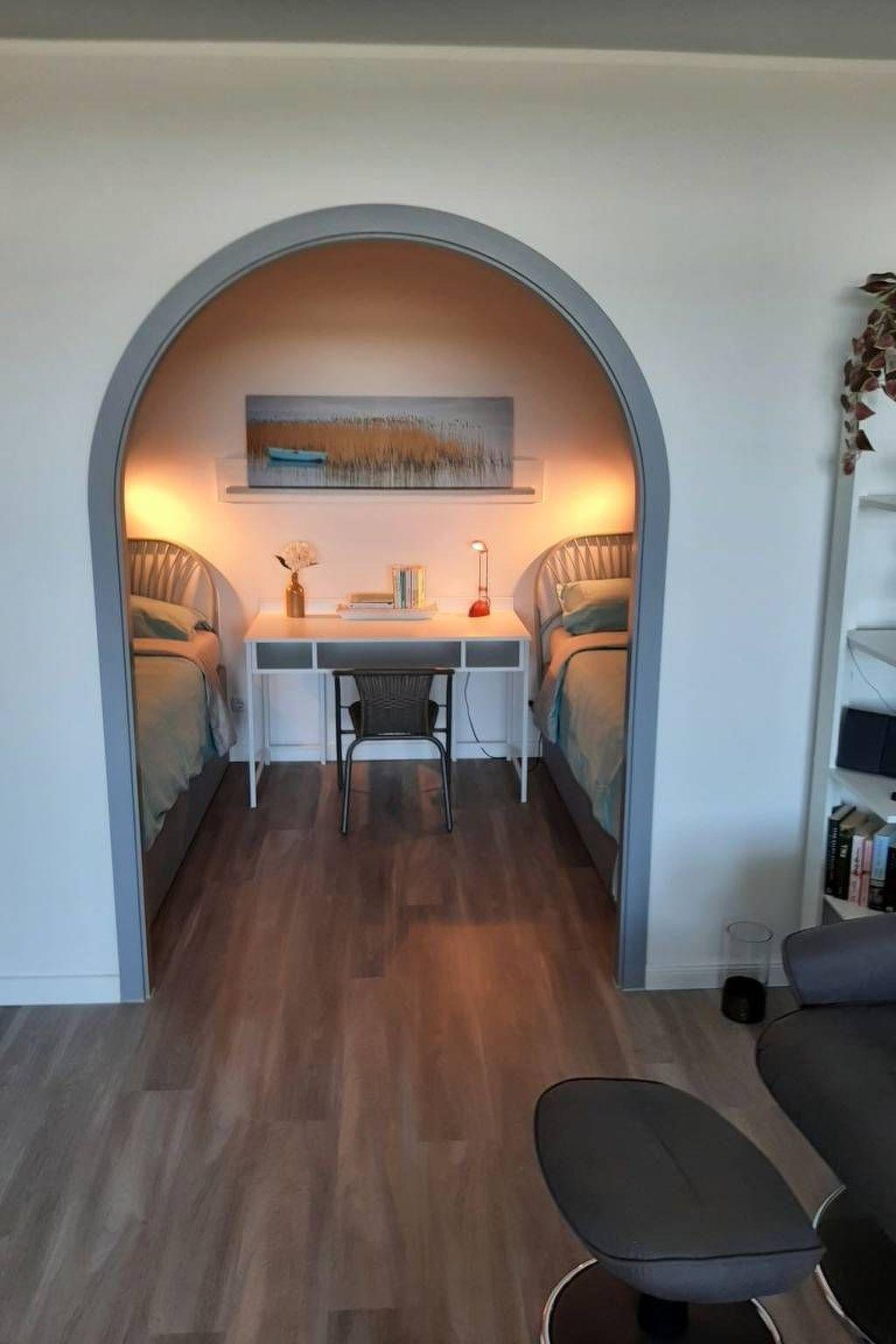 Der Schlafraum ist abgetrennt durch einen Rundbogen mit Verdunklungsmöglichkeit. 2 Boxspringbetten 200 x 90 cm und einem Schreibtisch mit Stuhl, Wandregal, Leselampen über den Betten sowie auf dem Schreibtisch.