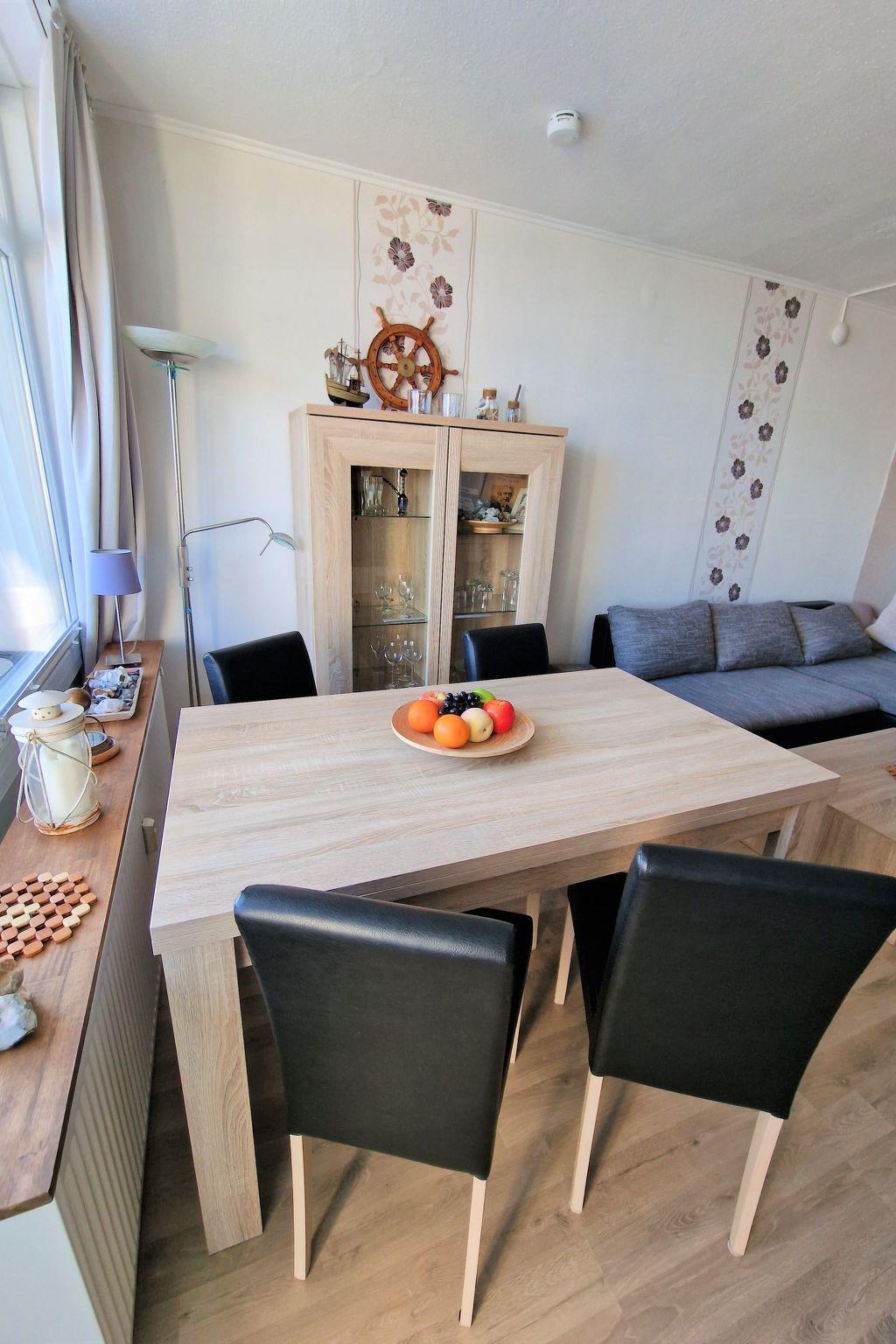 Die Essecke mit ausziehbarem Tisch und 4 Stühlen, Stehlampe, kl. Büfett mit Gläsern uvm. Große Fensterfront mit Plissee und Blick auf Binnensee/Jachthafen und Ostsee. Ausgang zum Balkon.
