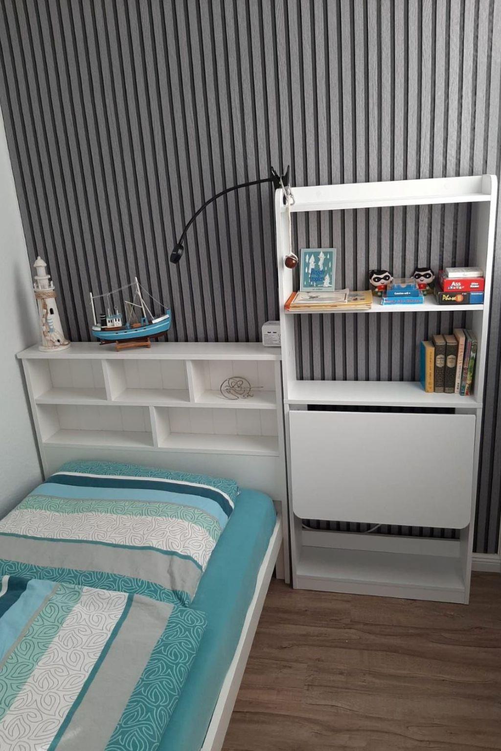 Sep. Zimmer abgehend vom Wohnzimmer verfügt über ein Fenster, 1 Einzelbett 90x200 cm und Regal mit Schreibtischfläche, Verdunklungsmöglichkeit.