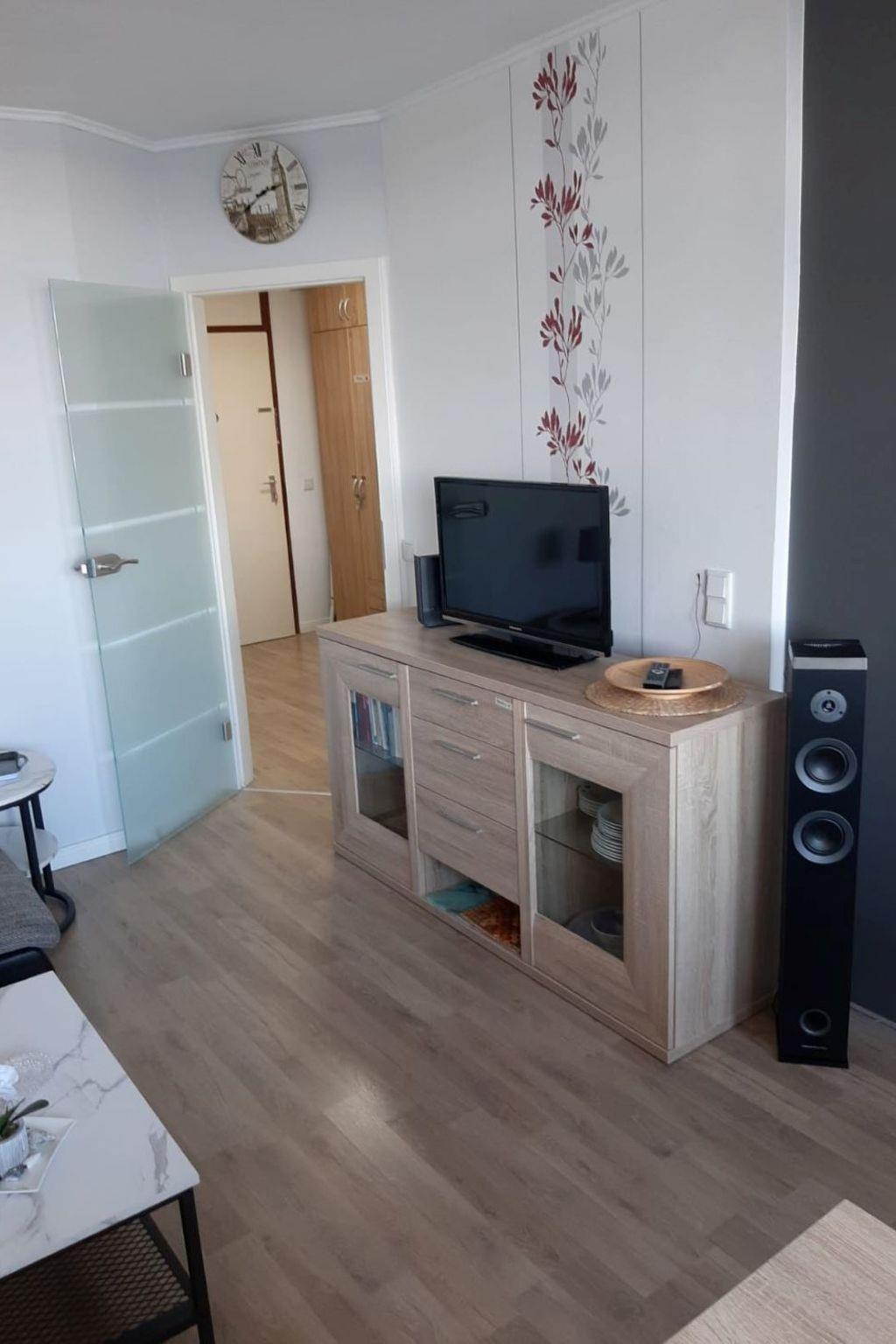 Das WZ ist mit einer neuen grauen Sitzgarnitur (auch als Schlafcouch nutzbar), Couchtisch, Sideboard, 81cm LCD-TV/Musikturm m. Bluetooth, True Wireless, USB/SD-Anschluss, FM-Radio sowie WLAN ausgestattet. Einige Bücher sowie Spielesammlung vorhanden.