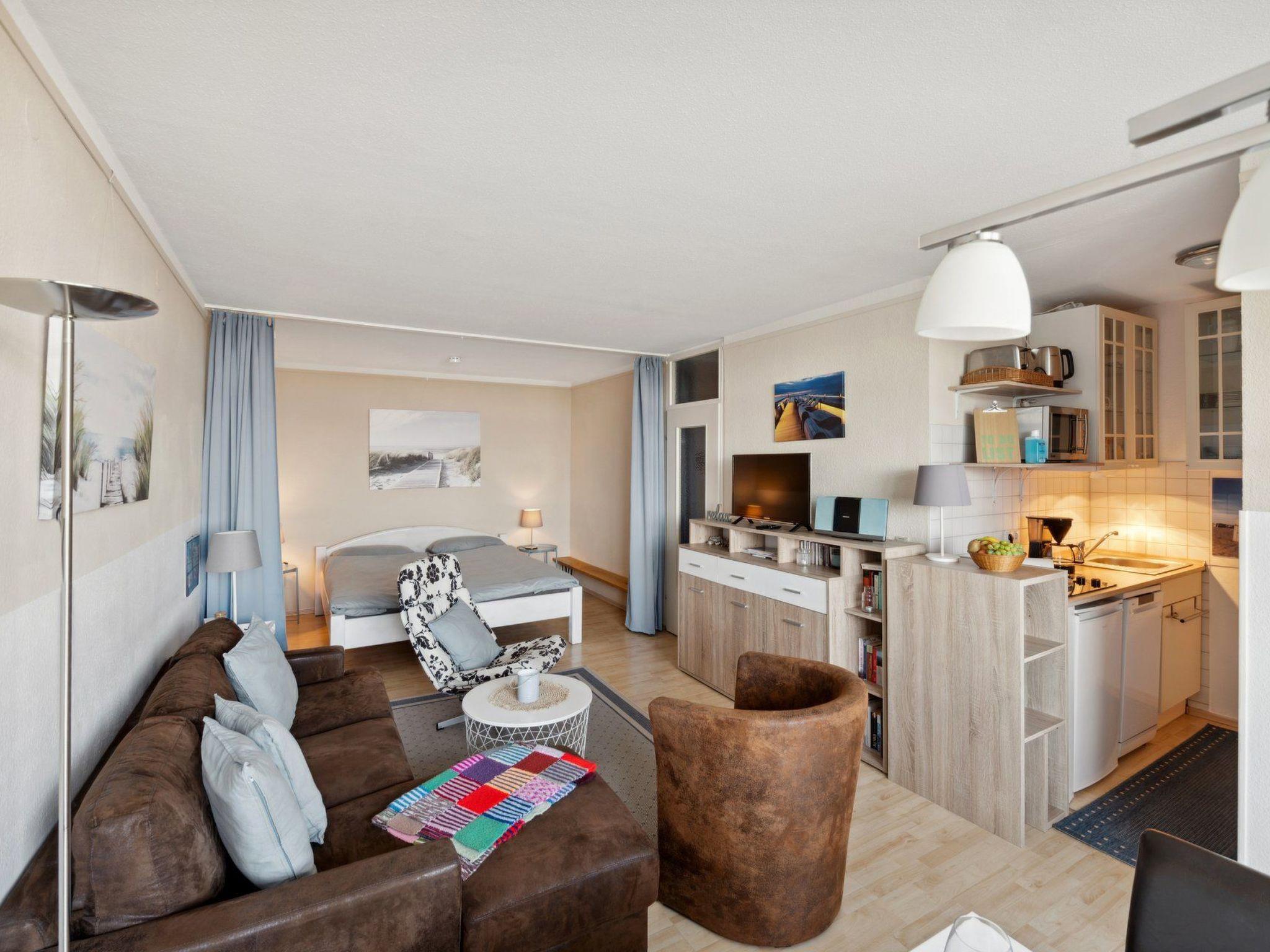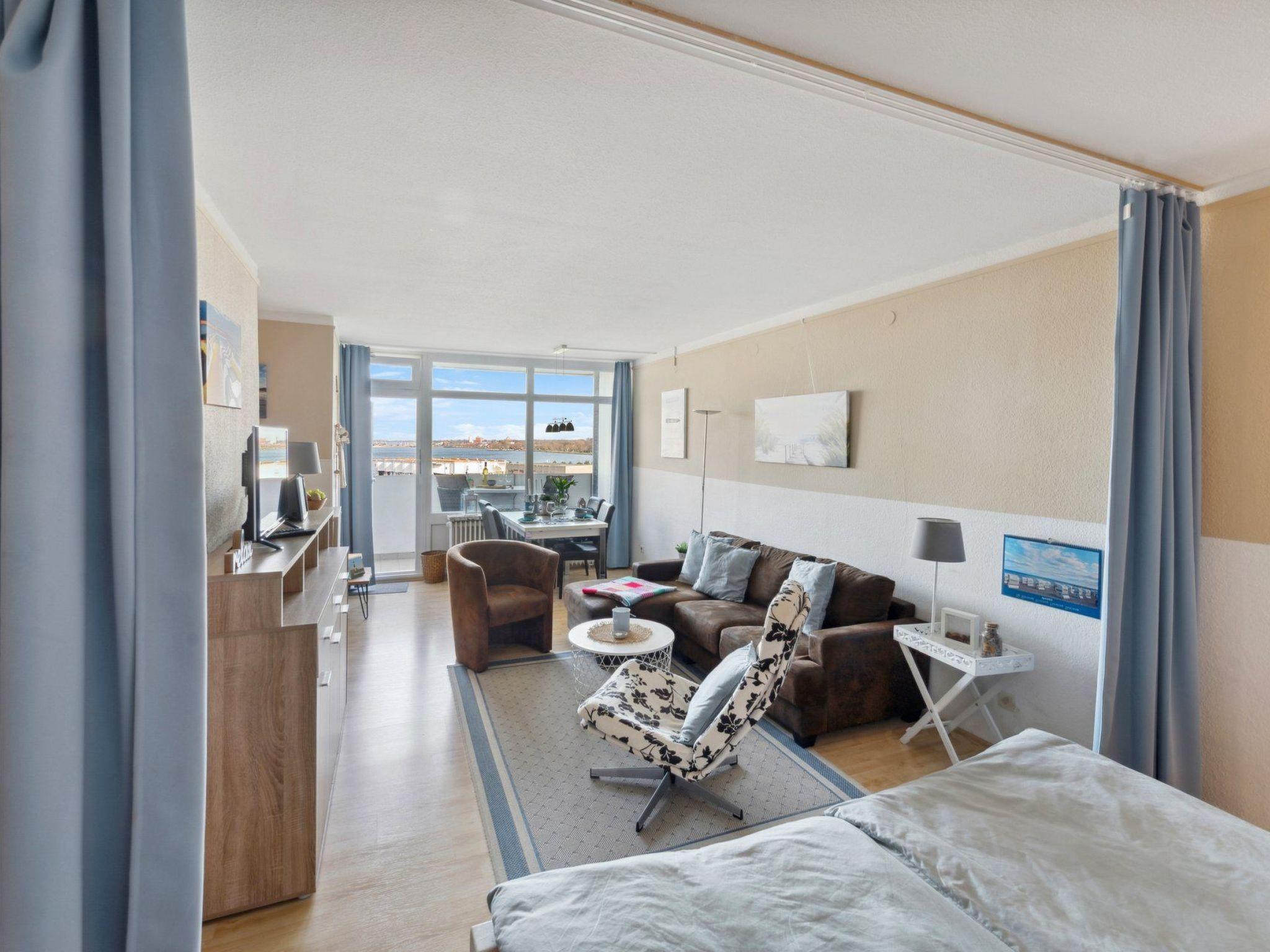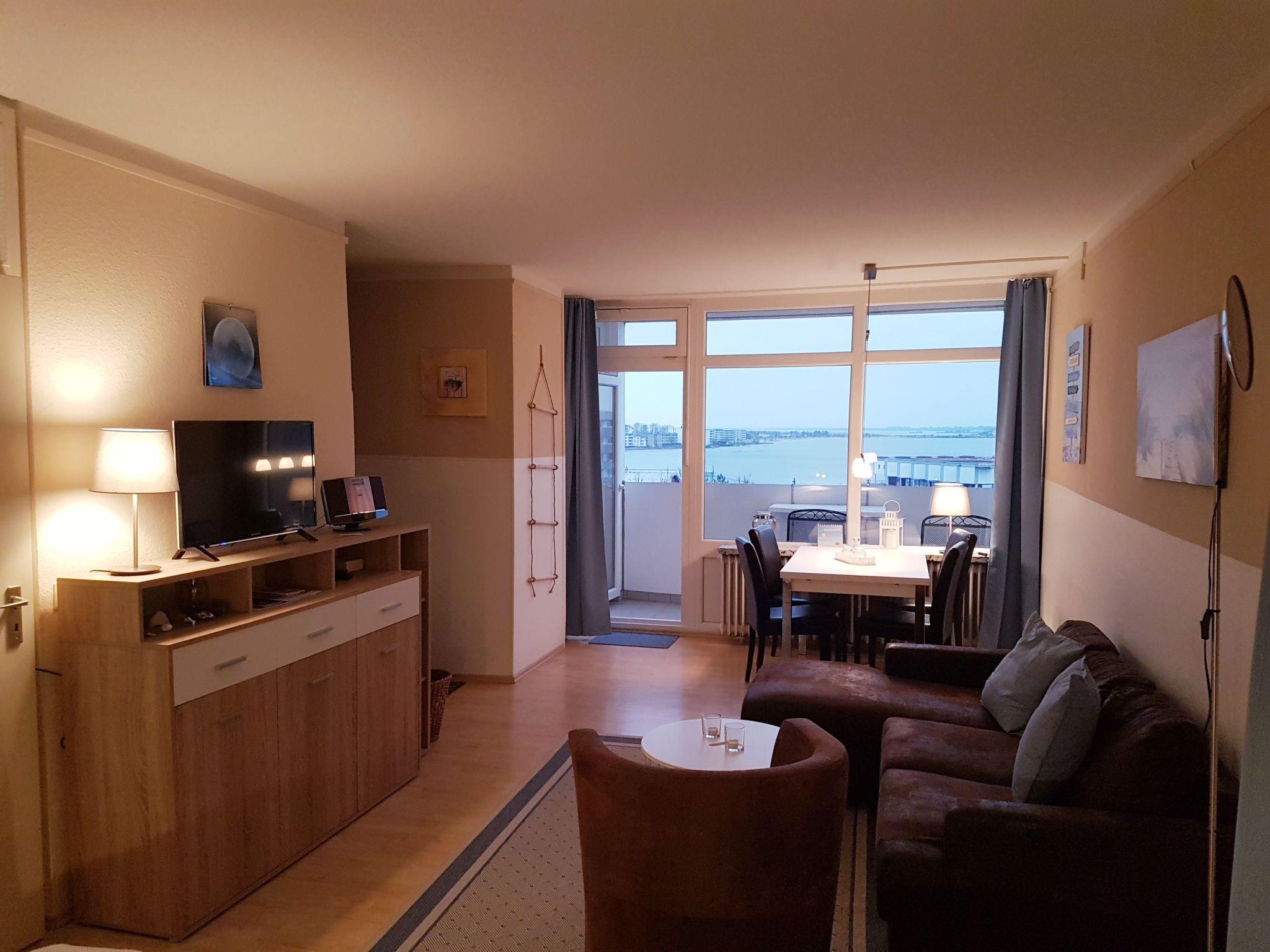 Sonstige Wohnzimmerausstattung : Der kombinierte und helle Wohn- u. Schlafbereich ist modern und konfortabel ausgestattet. Im hinteren Bereich , durch einen Vorhang abtrennbar befindet sich das Doppelbett. Der Wohnbereich ist mit allem notwendigen für einen schönen Urlaubsaufenthalt ausgestattet. Eine Couchecke mit Recamiere lädt zum Verweilen ein. Am Fenster befindet sich ein ausziehbarer Esstisch mit vier bequemen Hochlehnstühlen. Vom gesamten Wohn- u. Schlafbereich genießen Sie einen fantastischen Blick über die Ostsee und den Binnensee. Und das schönste, die Wohnung ist für Ihre Nachbarn uneinsichtig. Ausgestattet ist das Wohnzimmer mit SAT TV, WLAN, einigen Extras wie CD's ,Bücher u. Spielen.
