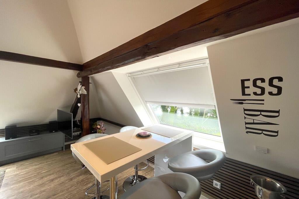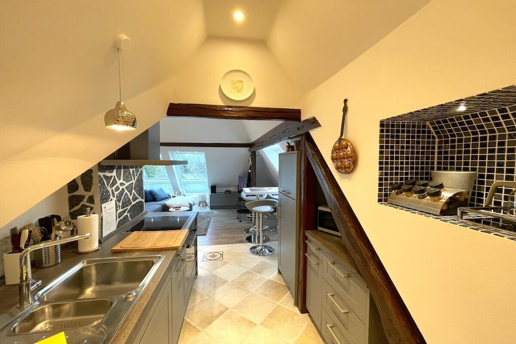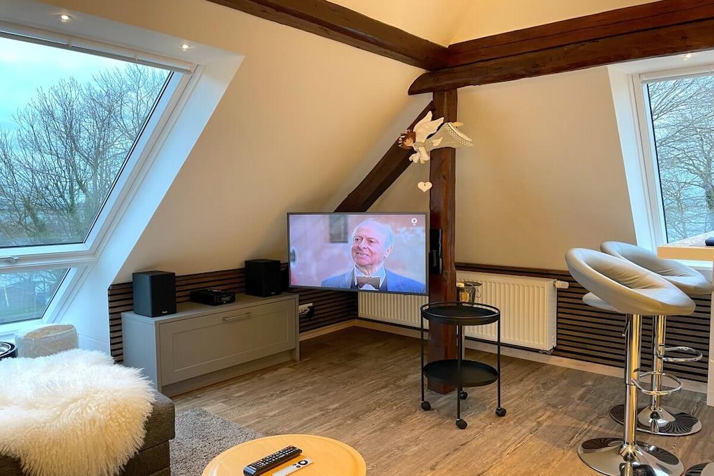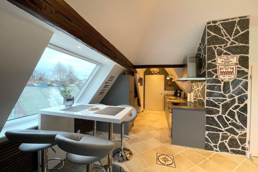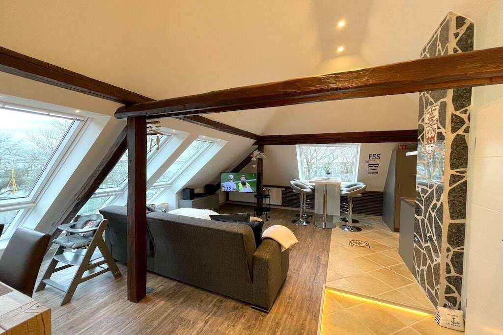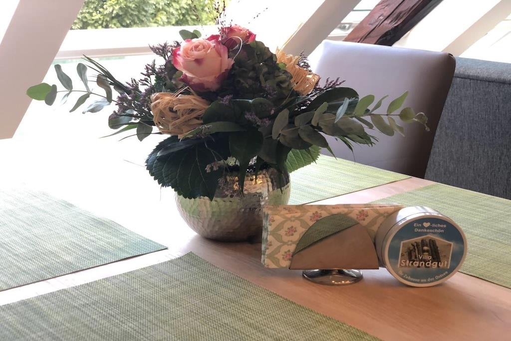 Freuen Sie sich auf die stilvolle Einrichtung der Ferienwohnung „Strandgut“, die sich im Dachgeschoss unserer renovierten Villa Strandgut befindet und ca. 49 m² groß ist. Der offene Wohn- und Essbereich verfügt über einen schwenkbaren 42-Zoll-LED-Fernseher, Apple TV und ein gemütliches Sofa. Die Luxusküche ist gut ausgestattet und Sie können an einem echten Eichentisch speisen, während Sie durch fünf große Velux-Fenster den Blick auf die Ostsee genießen. Zur Wohnung gehören außerdem eine hochwertige Musikanlage von Teufel und eine Sammlung von Brettspielen. Beide Badezimmer verfügen über hochwertige Armaturen von Villeroy & Boch, ergänzt durch elegante Mosaike. Das Rainshower-System von Grohe und eingebaute Lautsprecher mit Bluetooth sorgen für ein entspanntes Duscherlebnis. Jedes der beiden Schlafzimmer verfügt über einen Fernseher, Oberlichter mit elektrischen Rollläden und eine Spielmatte für Kinder. Draußen erwartet Sie eine neu gepflasterte, überdachte Terrasse mit Sitzgelegenheiten, Heizungen, einem Strandkorb, Sonnenliegen und einem Grill, die alle nach Südwesten ausgerichtet sind, um Nachmittags- und Abendsonne zu genießen. Für zusätzlichen Komfort stehen Steckdosen zur Verfügung. Ein Parkplatz ist auf dem Grundstück vor der Villa inklusive. Genießen Sie Ihren Aufenthalt!