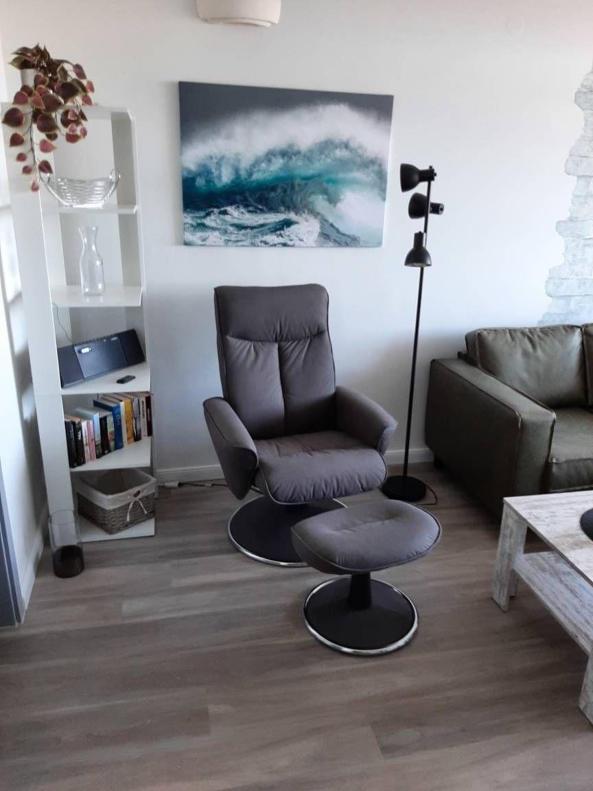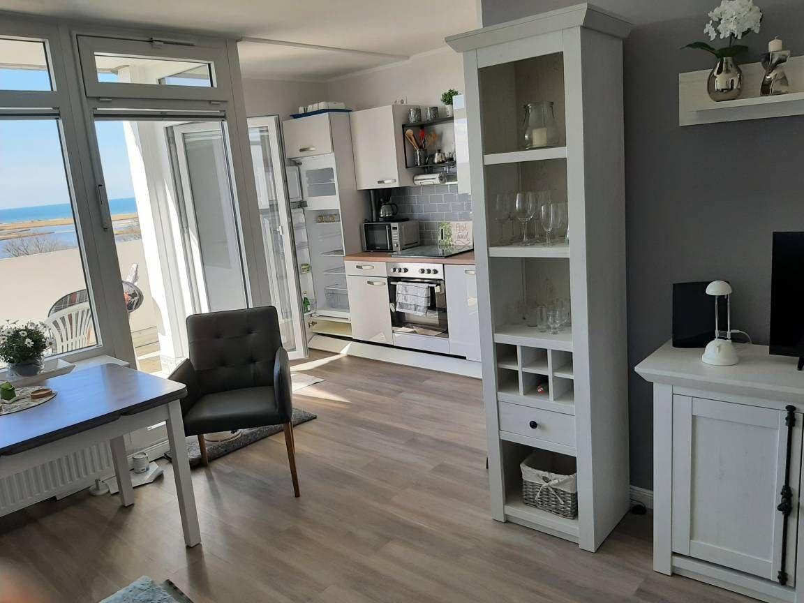 Lampen an den Wänden, WLAN, Heizung, Spielesammlung, Bücher, Große Fensterfront mit Plissee und Blick auf die Ostsee und Naturschutzgebiet, Tisch und 2 Ledersessel, Ausgang Balkon.