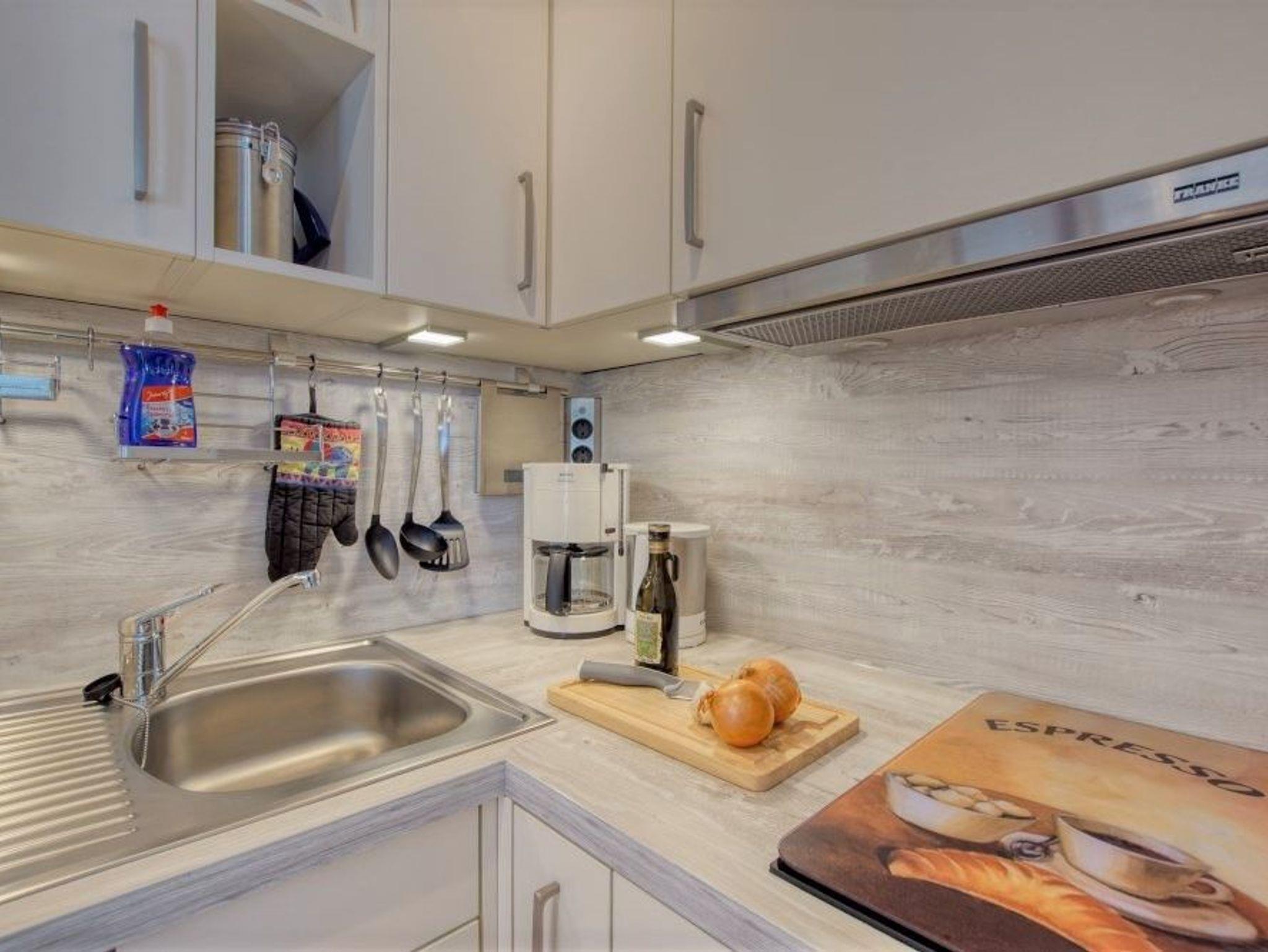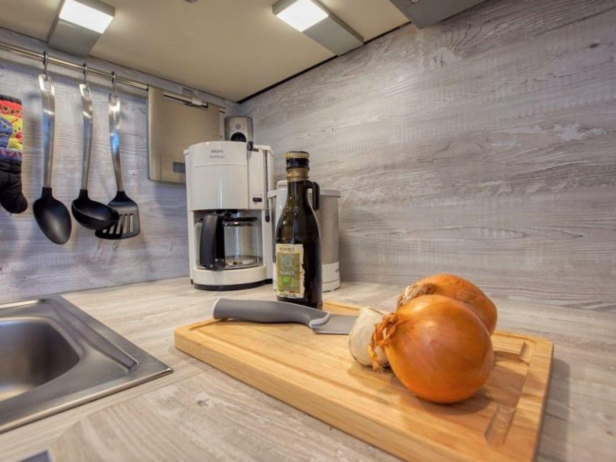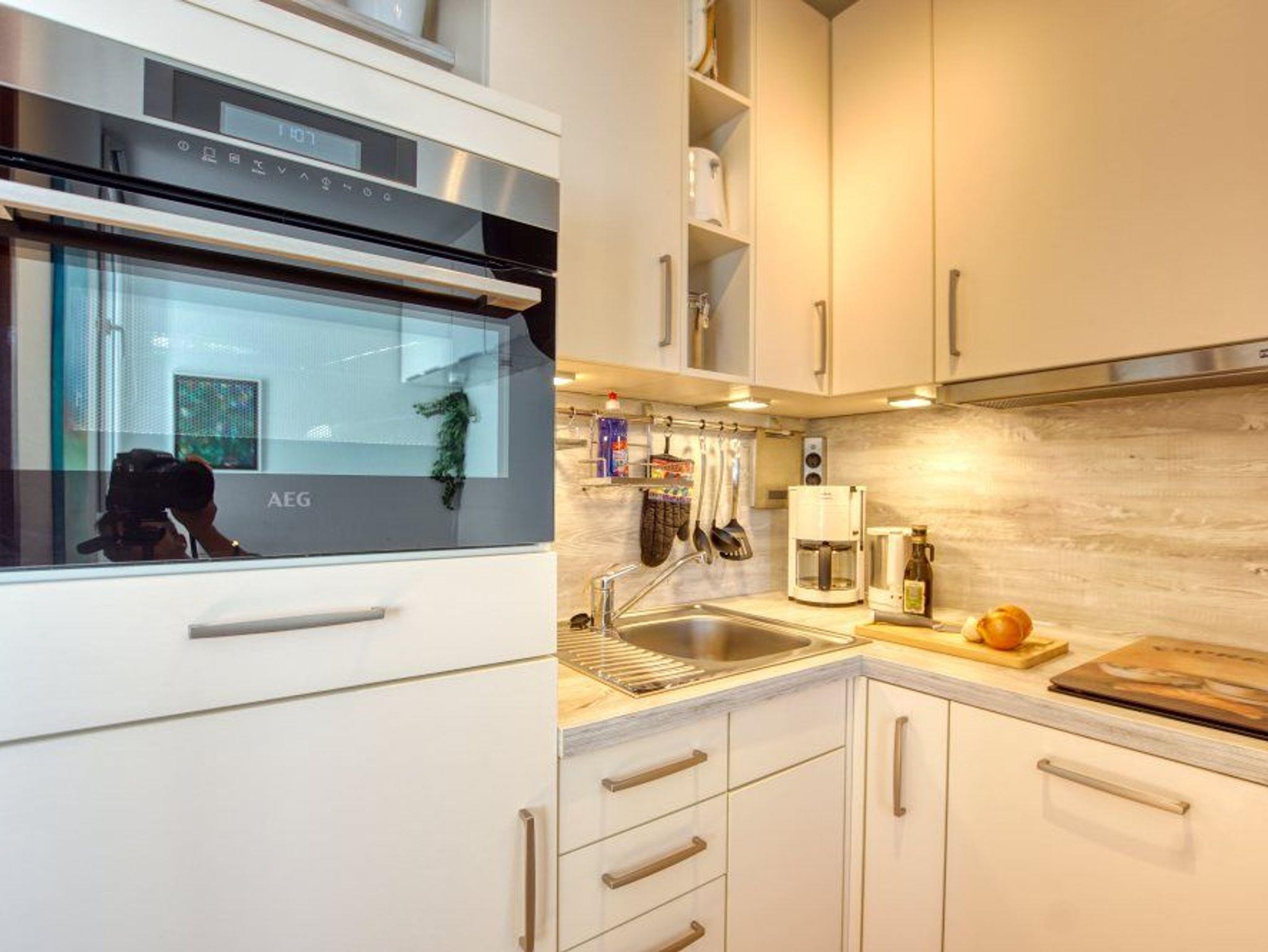 Voll ausgestattete Küche mit Kühlschrank inkl. Gefrierfach, Backofen, Mikrowelle, Geschirrspüler, 2-Platten-Ceranfeld, Kaffeemaschine, Wasserkocher, Toaster, Eierkocher