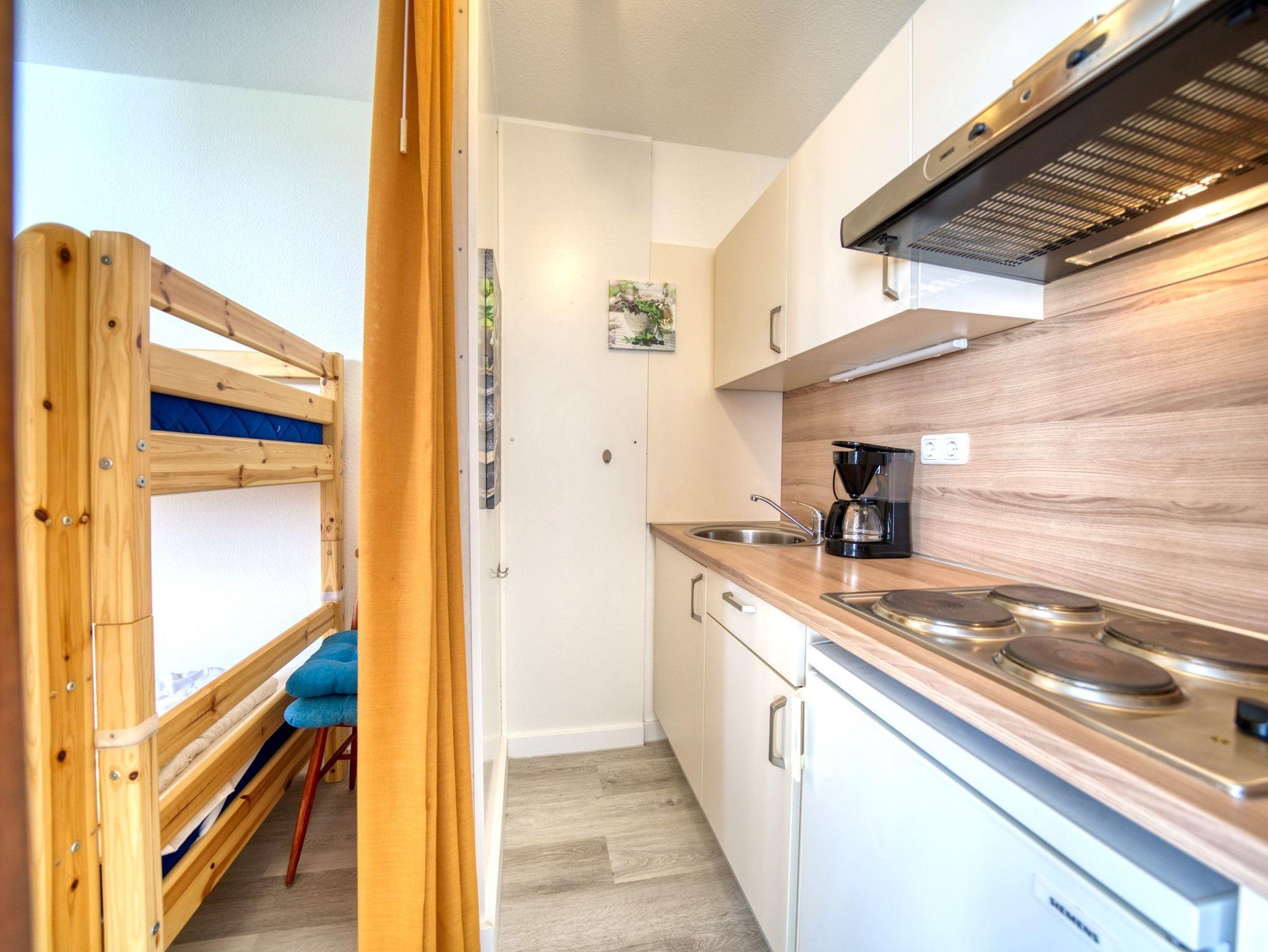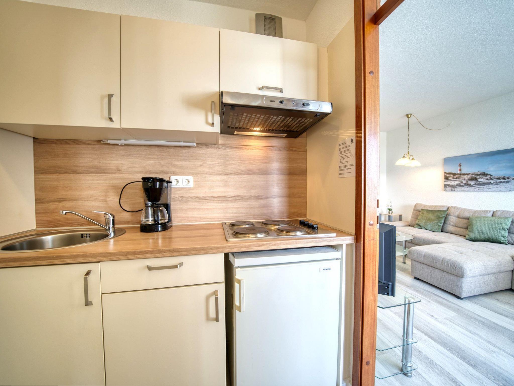 Praktische Küche mit 4-Plattenherd, Kühlschrank mit Gefrierfach, Filterkaffeemaschine, Toaster und Wasserkocher