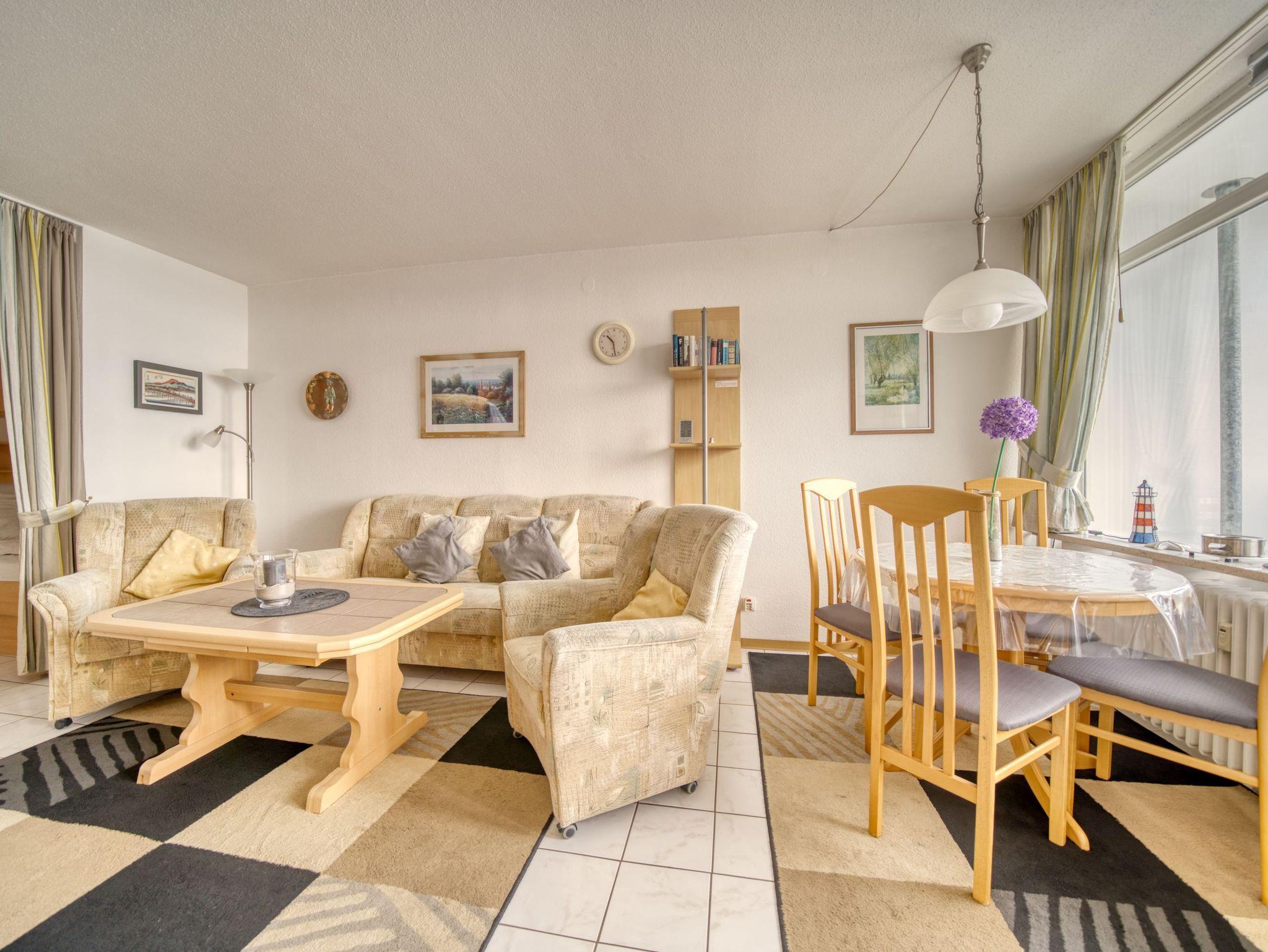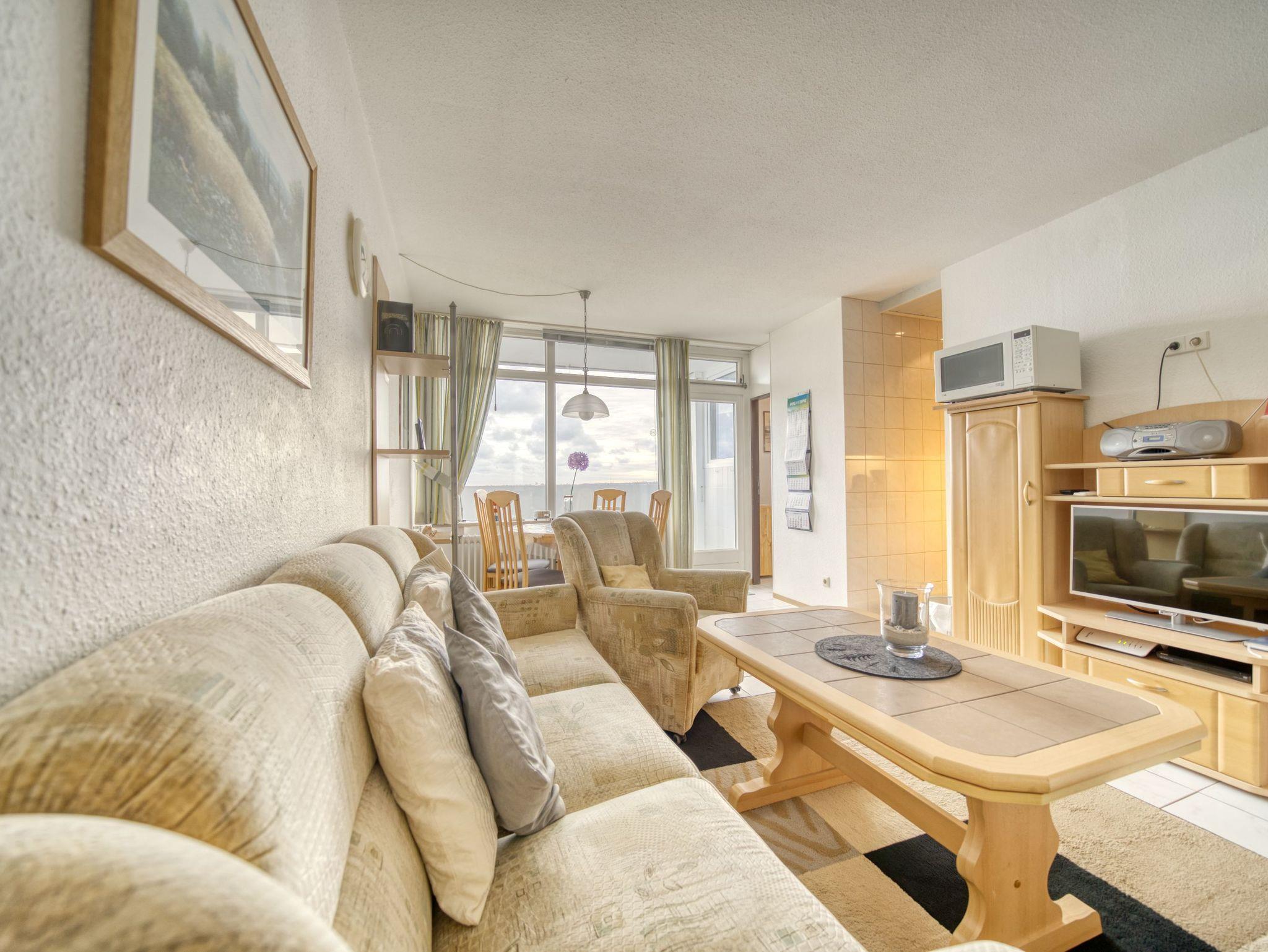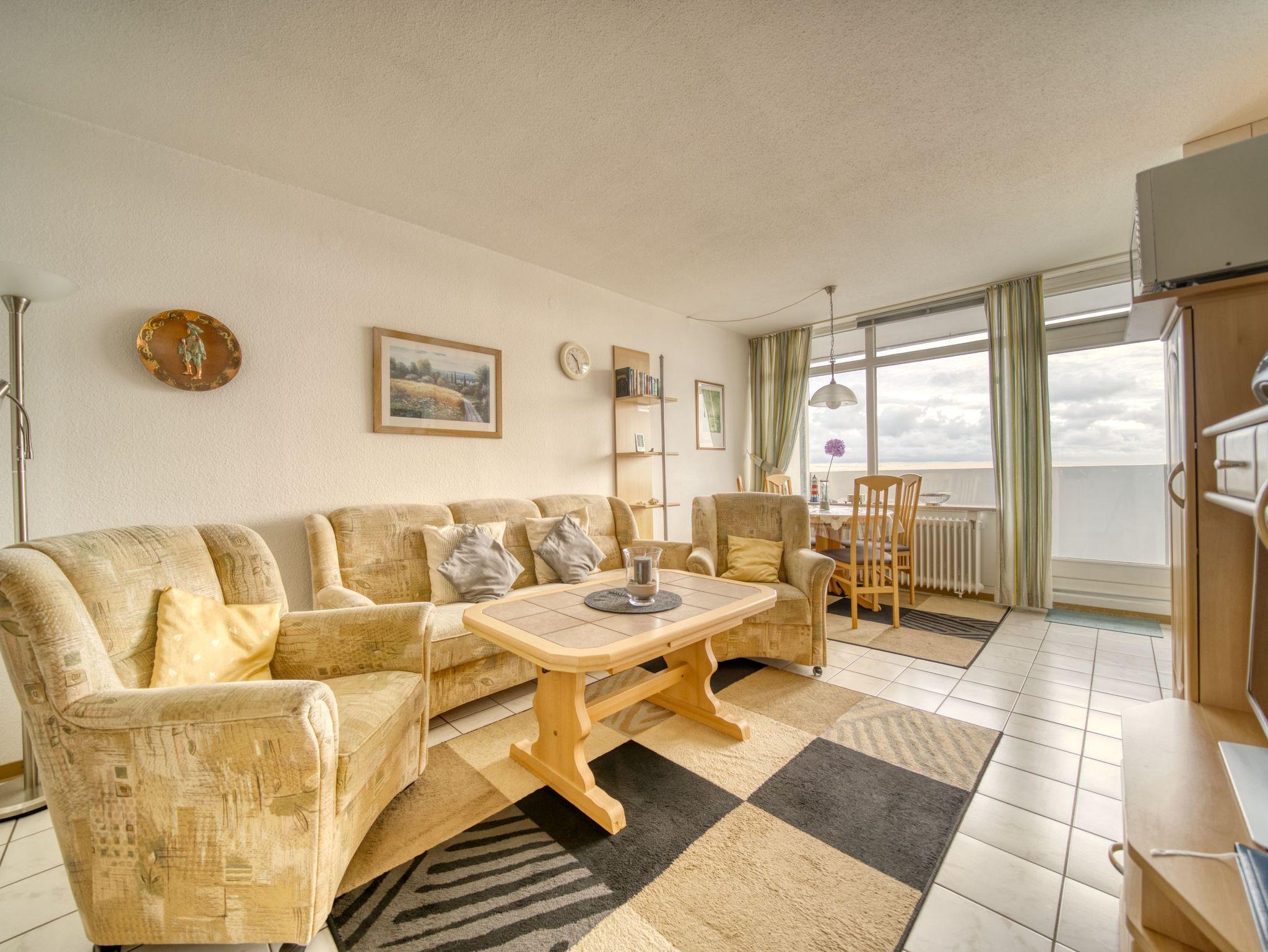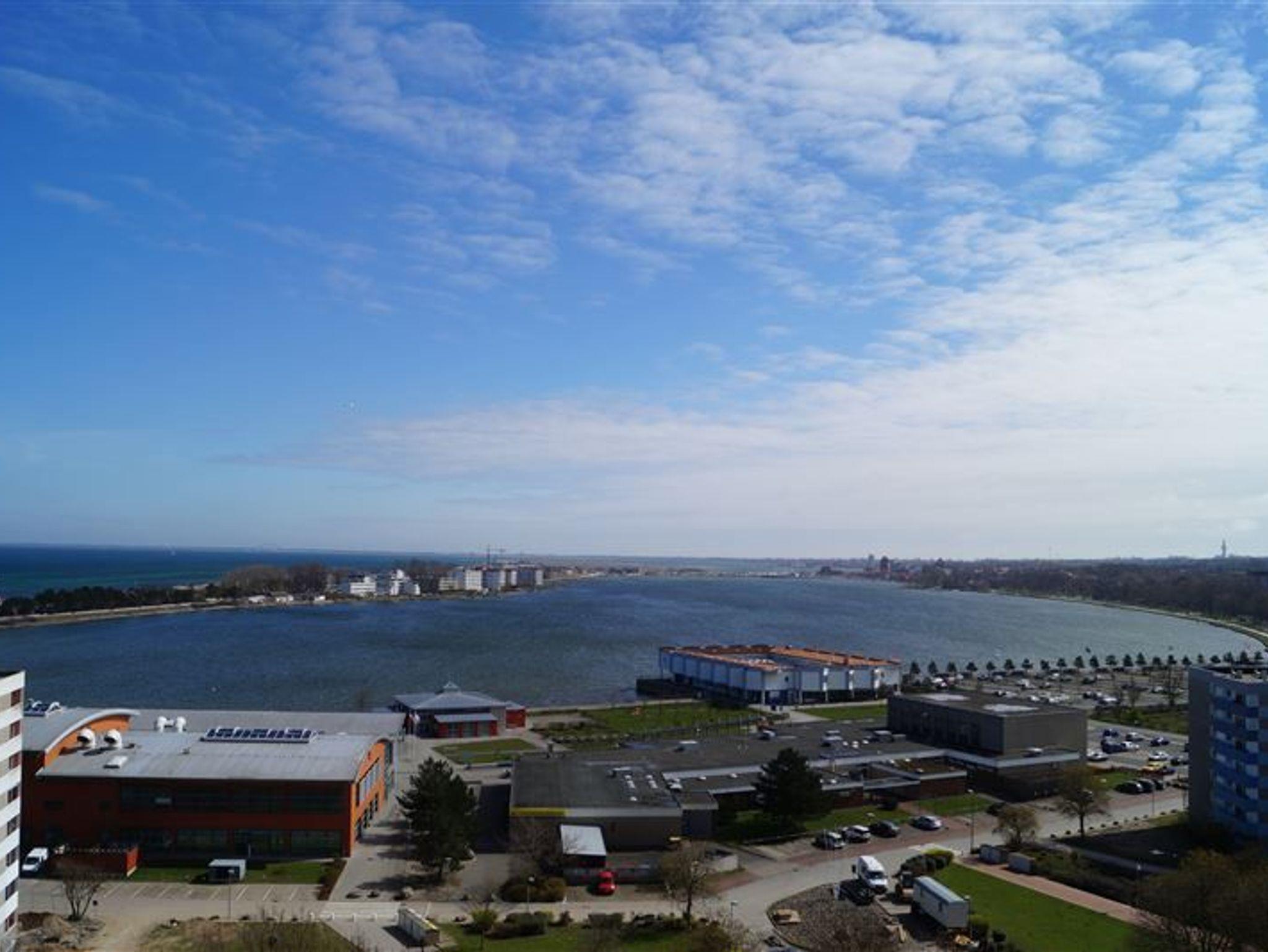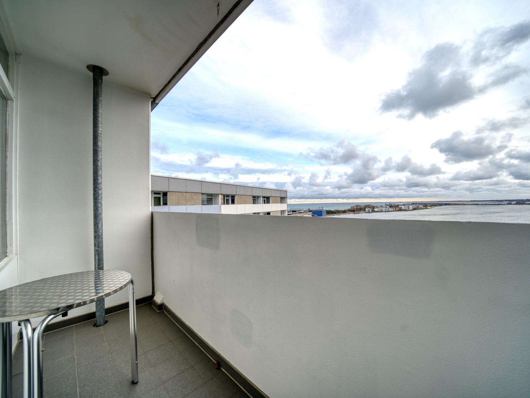 Die Ferienwohnung im Haus E, 12. Etage, mit Balkon zur Ostseite, bietet einen herrlichen Blick auf die Ostsee mit Fehmarnsundbrücke sowie den Binnensee mit Stadt und Yachthafen.