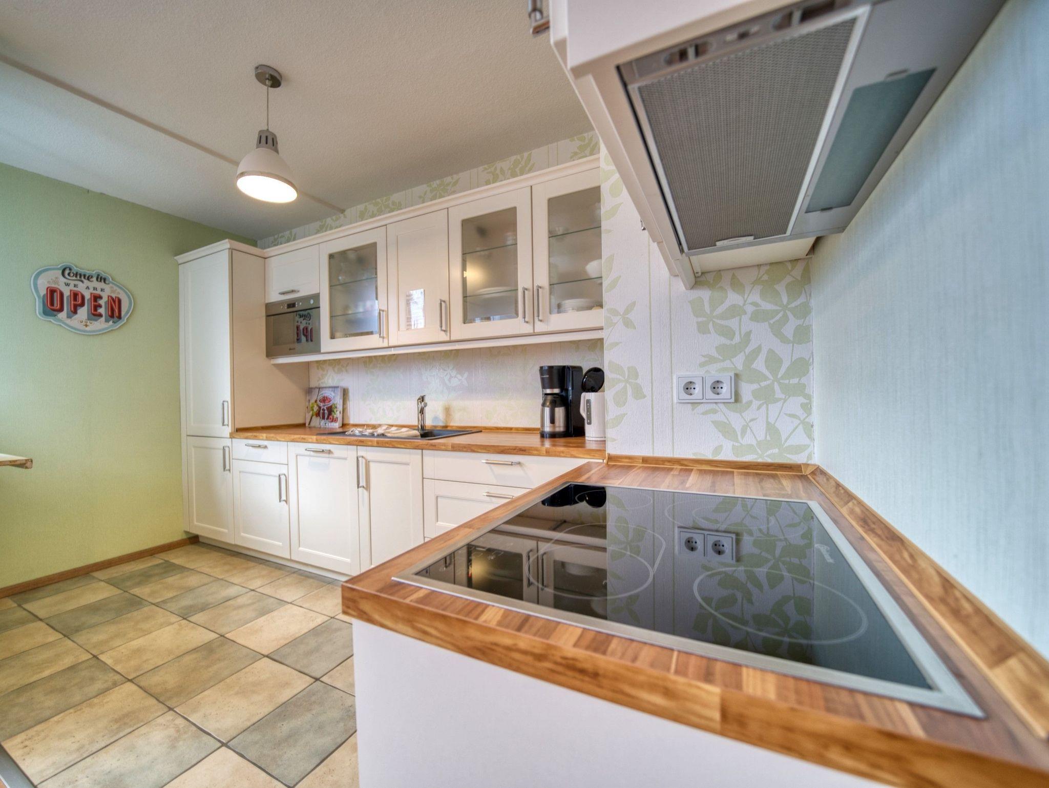 Komplett modernisierte Küche mit Kaffeemaschine, Wasserkocher, Toaster, Kühlschrank mit Gefrierfach, 4-Platten-Herd und Backofen