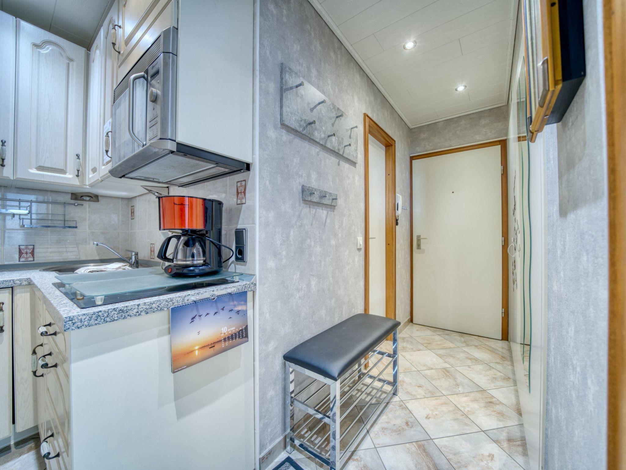 Küche mit Ceranherd, Mikrowelle, Kühlschrank mit Gefriermöglichkeit, Wasserkocher, Filterkaffeemaschine und Toaster