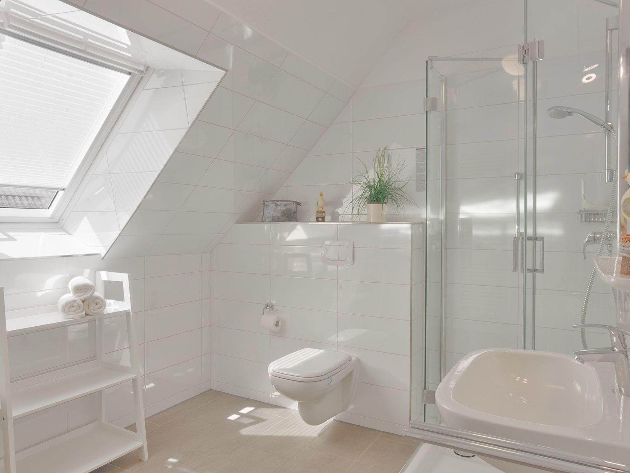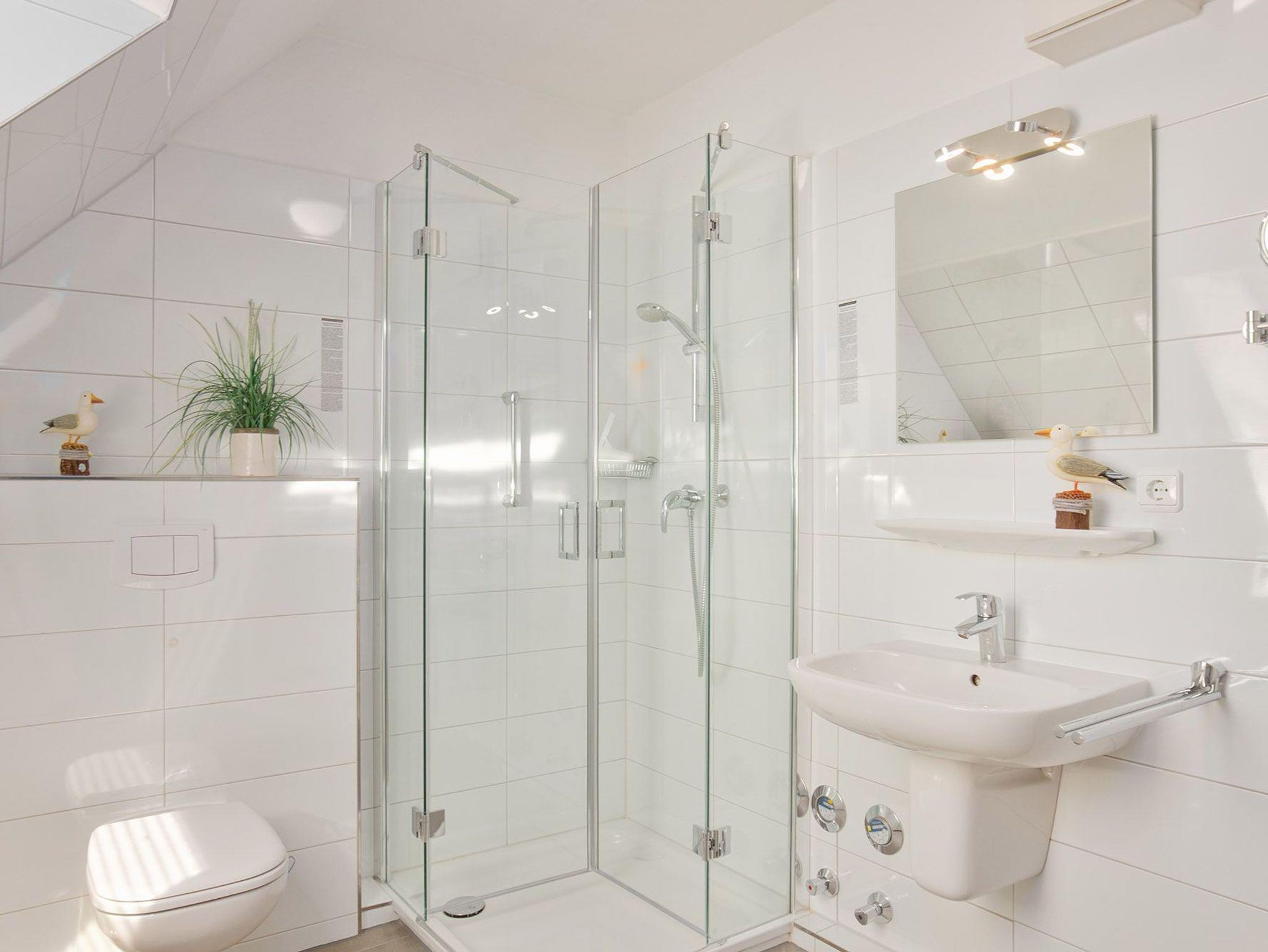 Das helle, moderne Duschbad mit Föhn, Rasierspiegel, Handtuchwärmer und Dachfenster sorgt für zusätzlichen Komfort. Pflegeleichte Böden tragen zum Wohlfühlambiente bei. Eine gemeinschaftlich nutzbare Waschmaschine, ein Trockner und eine Gefriertruhe stehen allen Gästen des Hauses kostenlos zur Verfügung. Im eigenen Abstellraum befinden sich zudem ein Bügeleisen, ein Bügelbrett und ein Wäscheständer.