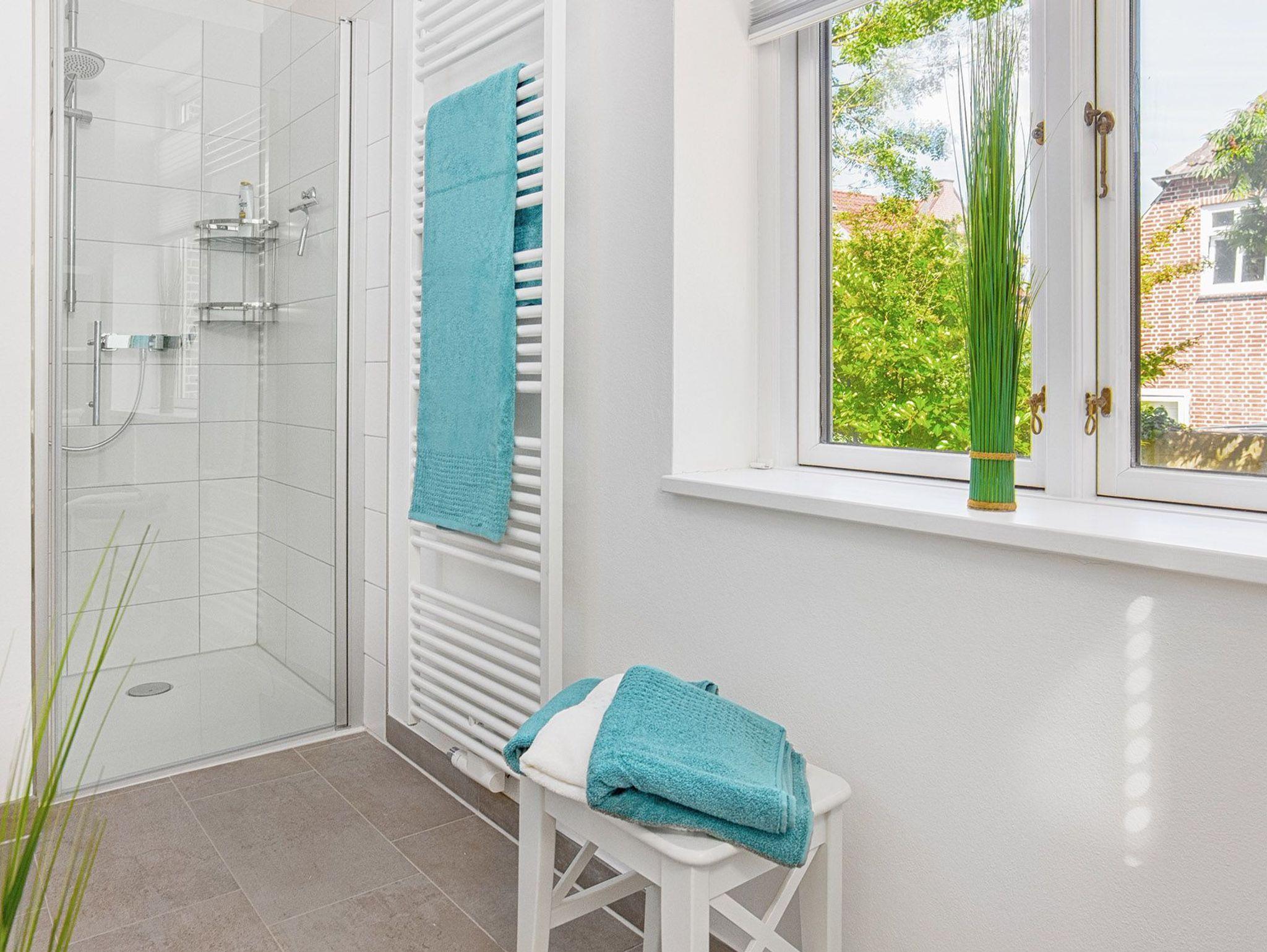 Das moderne Badezimmer ist mit einer ebenerdigen Dusche, einem Handtuchwärmer, Waschbecken und WC ausgestattet und bietet höchsten Komfort für eine erfrischende Auszeit. Zusätzlich gibt es im Erdgeschoss einen separaten Raum, der den Gästen des Gutshauses zur Verfügung steht. Hier befinden sich eine Waschmaschine, ein Bügeleisen und ein Bügelbrett für zusätzlichen Komfort während Ihres Aufenthalts.