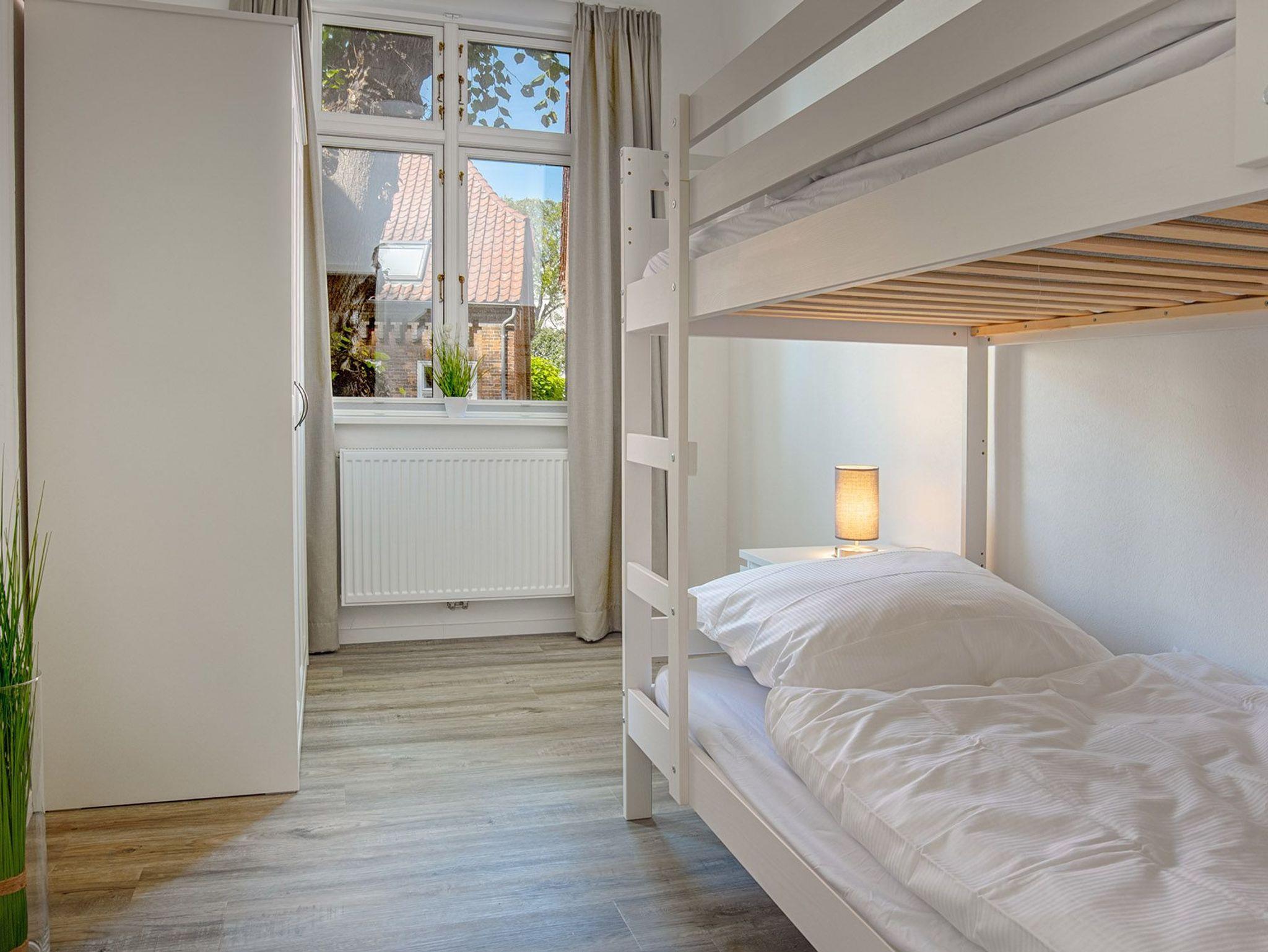Der offen gestaltete Wohnbereich lädt mit einer gemütlichen Couch, Smart-TV und WLAN zum Entspannen ein. Große Fenster und der angrenzende Wintergarten sorgen für eine helle, freundliche Atmosphäre und bieten einen wunderschönen Blick in das malerische Fischerdorf Heiligenhafen. Die Ferienwohnung eignet sich besonders für Familien, da sie über zwei Schlafzimmer verfügt: eines mit einem komfortablen Doppel-Boxspringbett (180x200 cm) und ein weiteres mit einem praktischen Etagenbett (je 90x200 cm). Für erholsamen Schlaf und ausreichend Privatsphäre sorgen blickdichte Plissees und Vorhänge. Auf Wunsch stehen allergikerfreundliche Bettwäsche, Handtuchsets, ein Babyreisebett (ohne Bettzeug) sowie ein Hochstuhl gegen eine geringe Gebühr zur Verfügung.