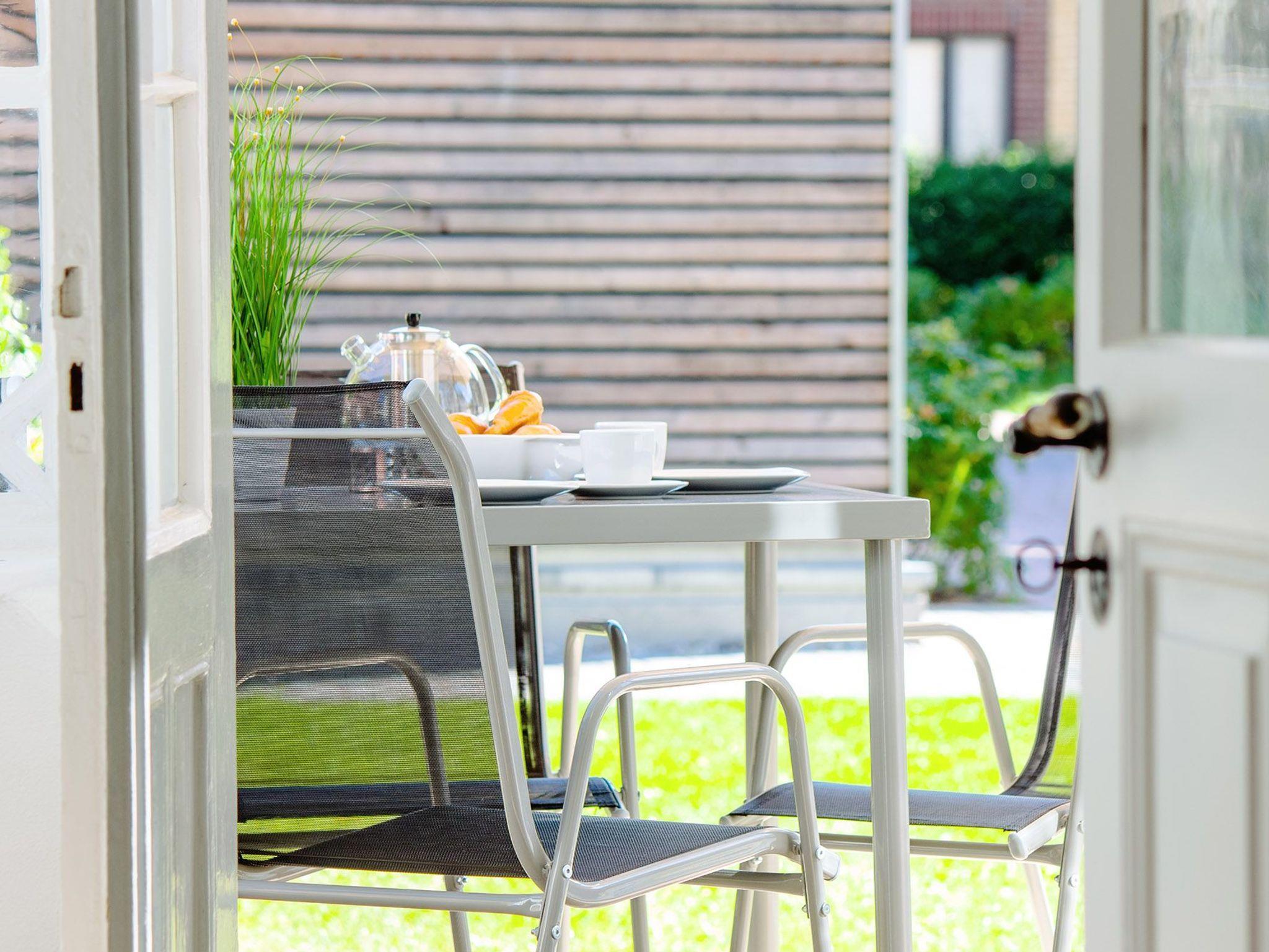 Die voll ausgestattete Küche ist in den Wohnbereich integriert und bietet alle Annehmlichkeiten für Ihre kulinarischen Bedürfnisse. Der angrenzende, großzügige Essbereich im Wintergarten verleiht Ihren Mahlzeiten mit seinen historischen Elementen eine besondere Atmosphäre. Eine möblierte Terrasse mit Sonnenschirm lädt zum Verweilen im Freien ein und ermöglicht Ihnen entspannte Grillabende unter freiem Himmel.