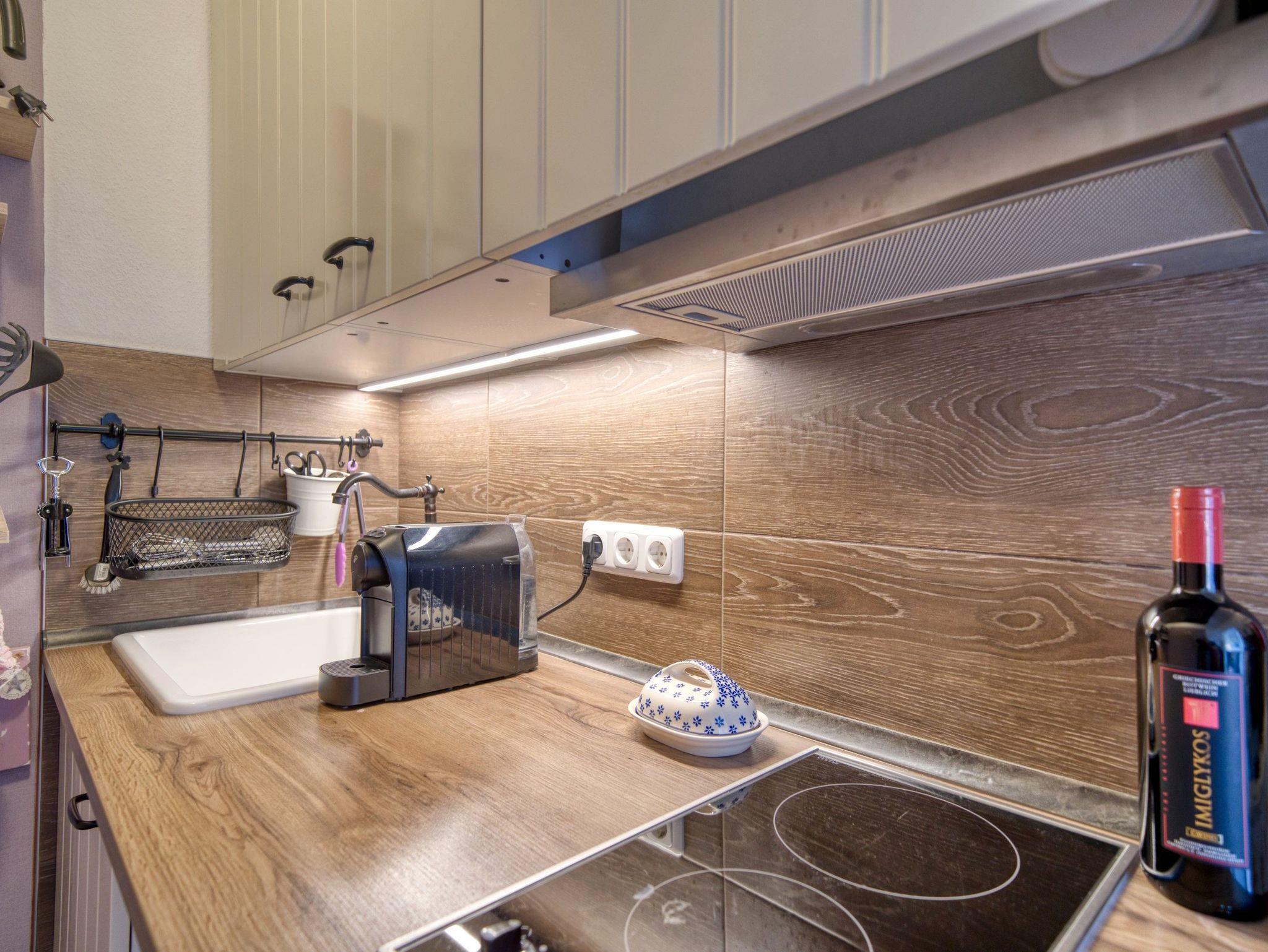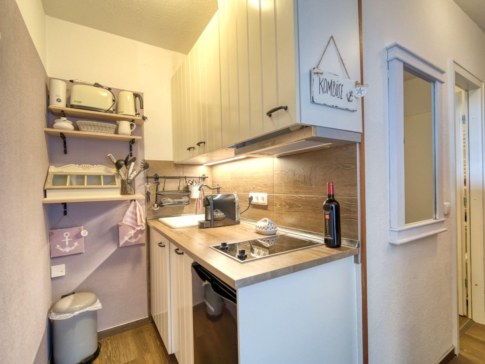 Küchenzeile im Flur mit 2-Platten-Ceranfeld, Geschirrspülmaschine und Kühlschrank