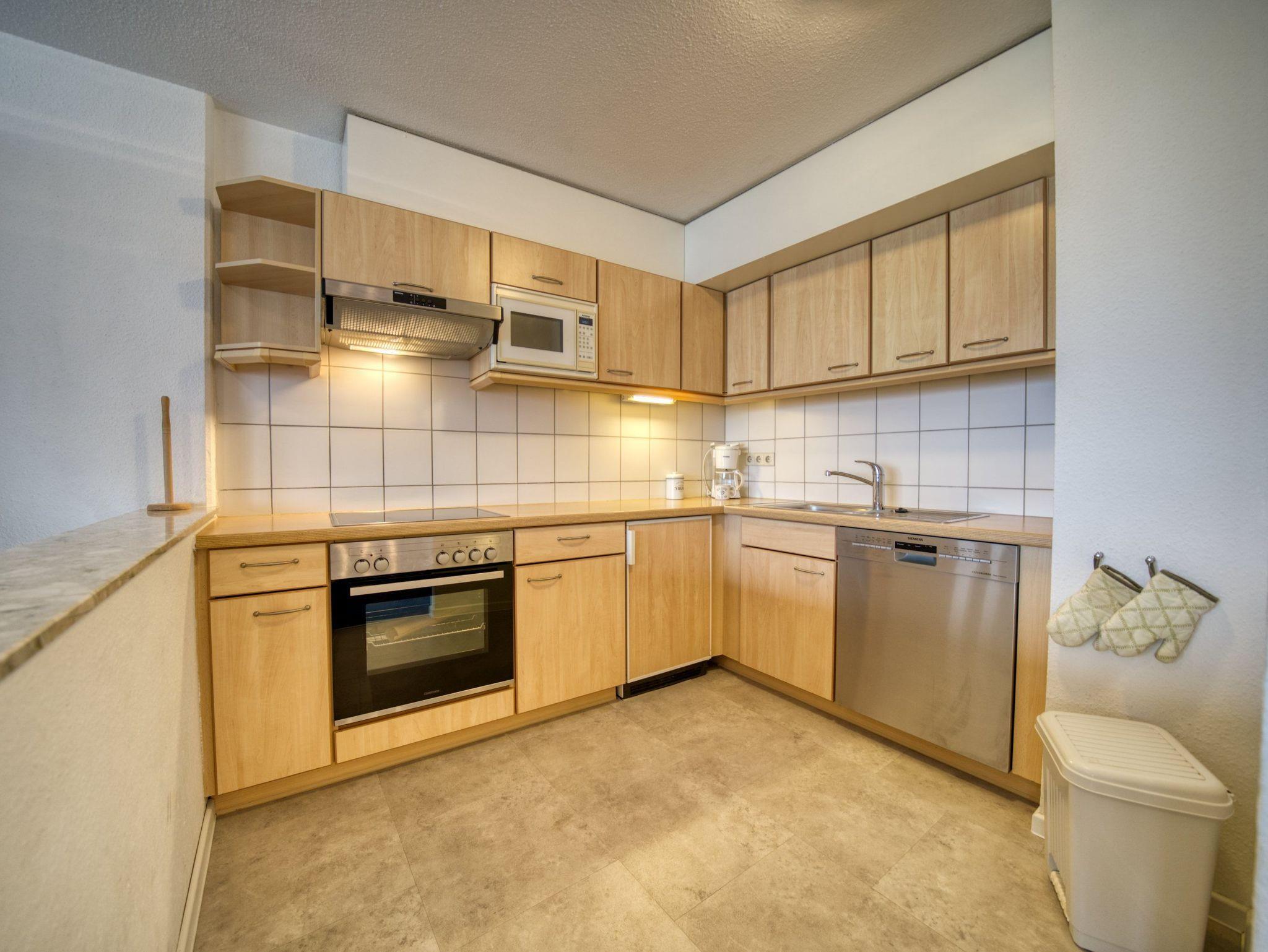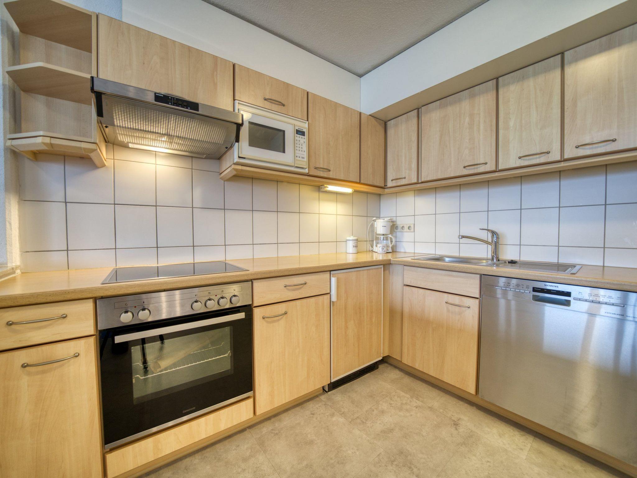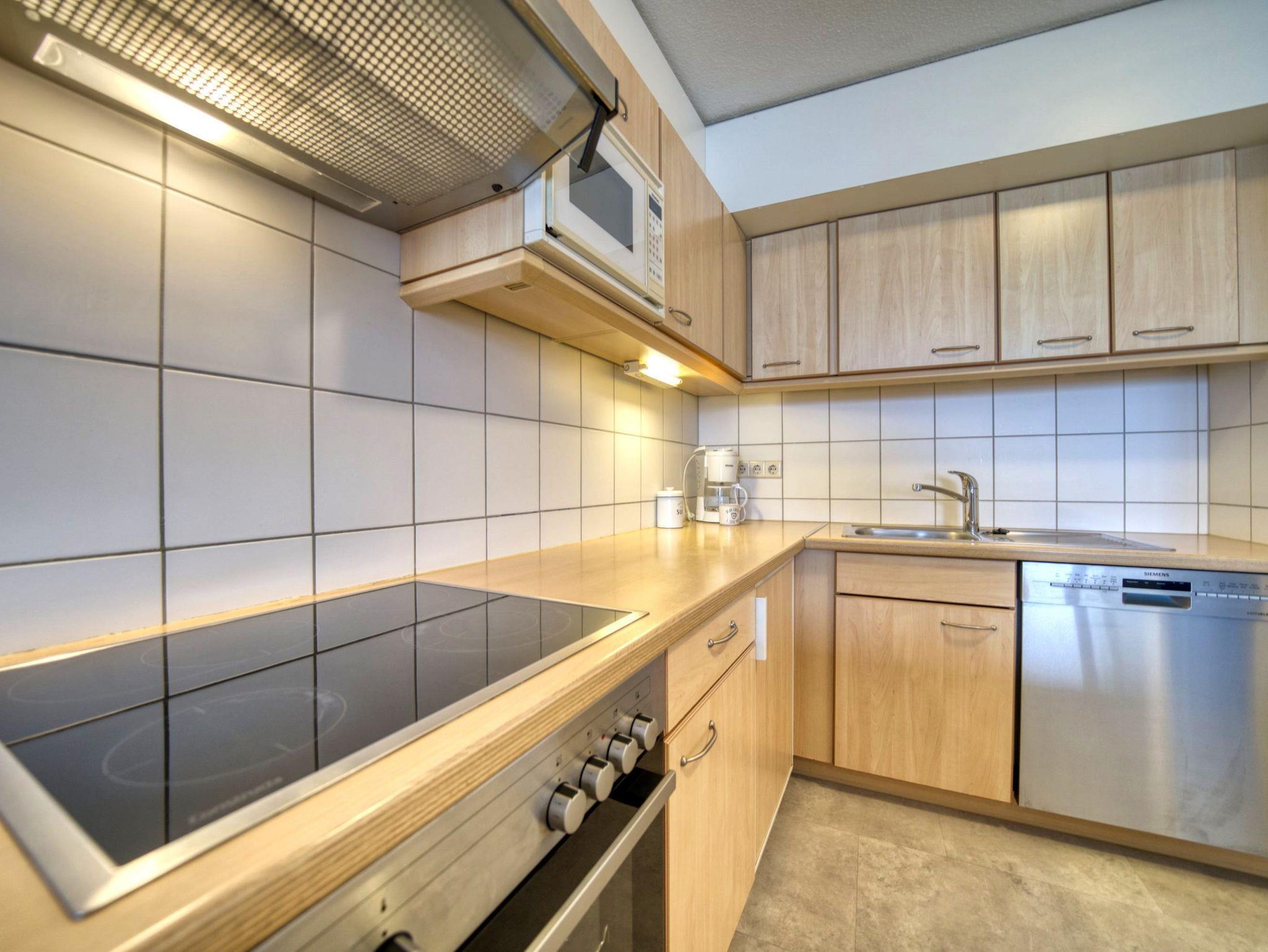 Küche: Offen und modern mit Geschirrspüler, Ceranfeld, Backofen, Mikrowelle, Filterkaffeemaschine und Wasserkocher