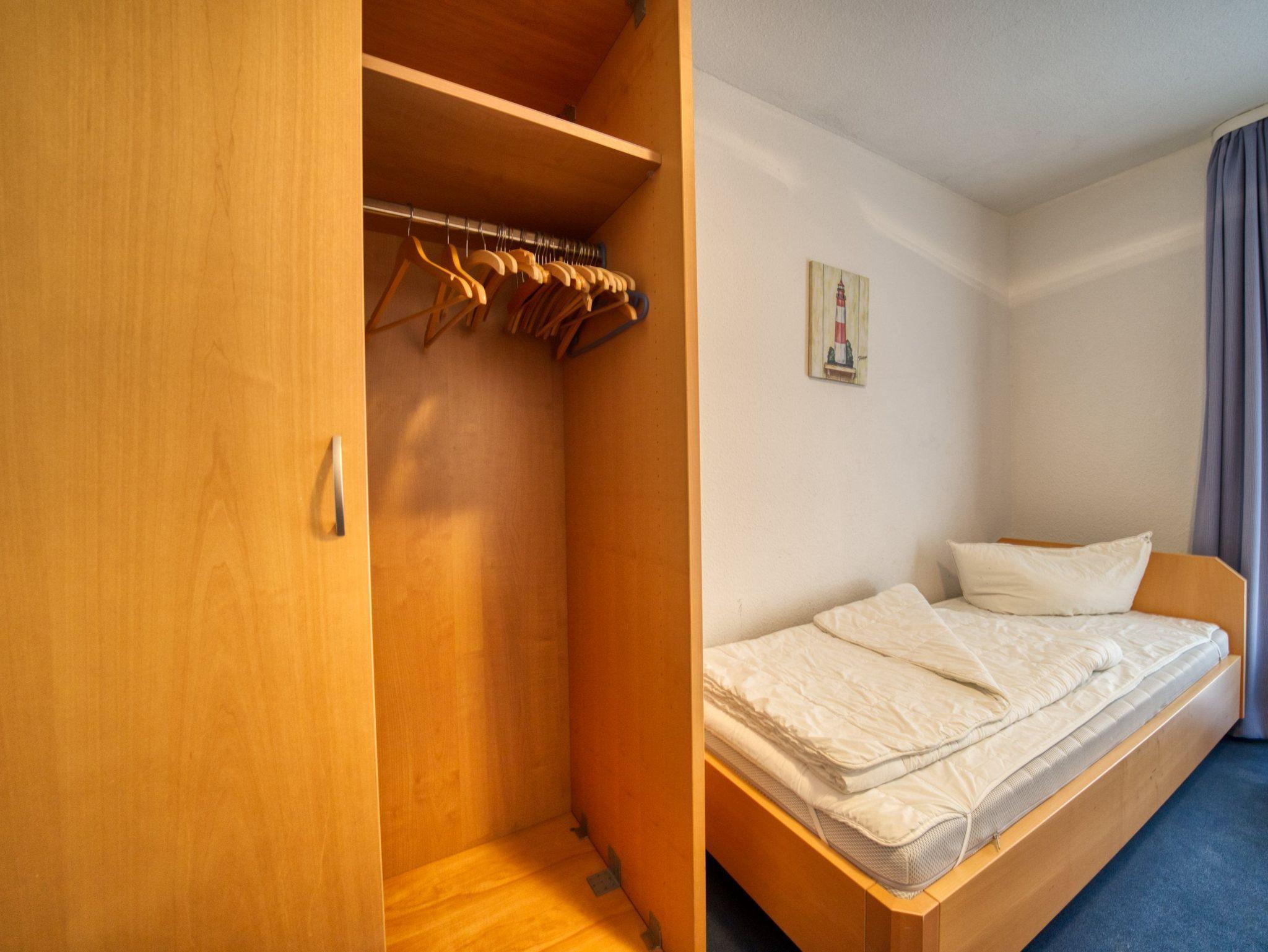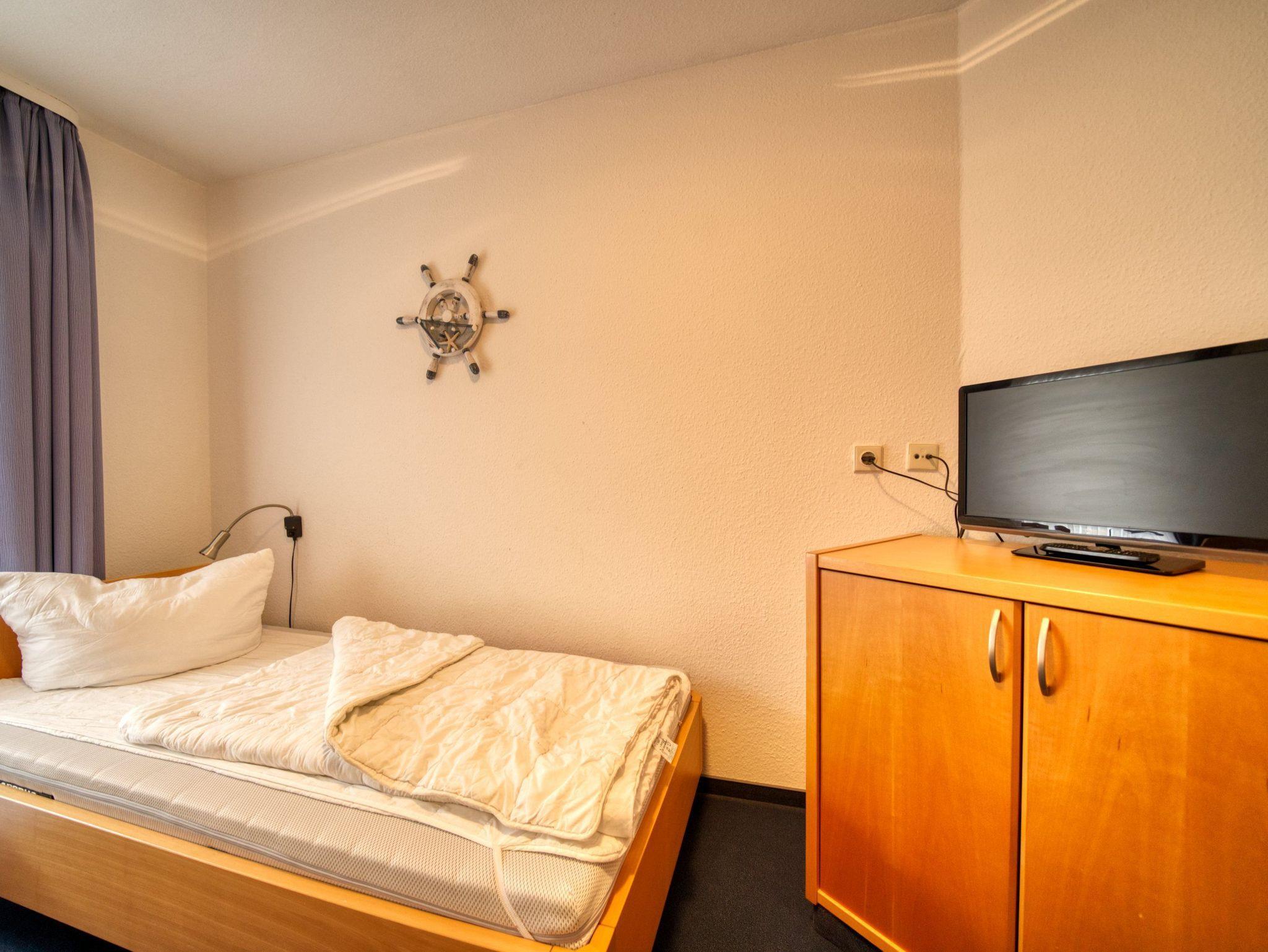 Kinderzimmer: Zwei Einzelbetten (90x200 cm), TV, Kleiderschrank, verdunkelbar durch Vorhänge