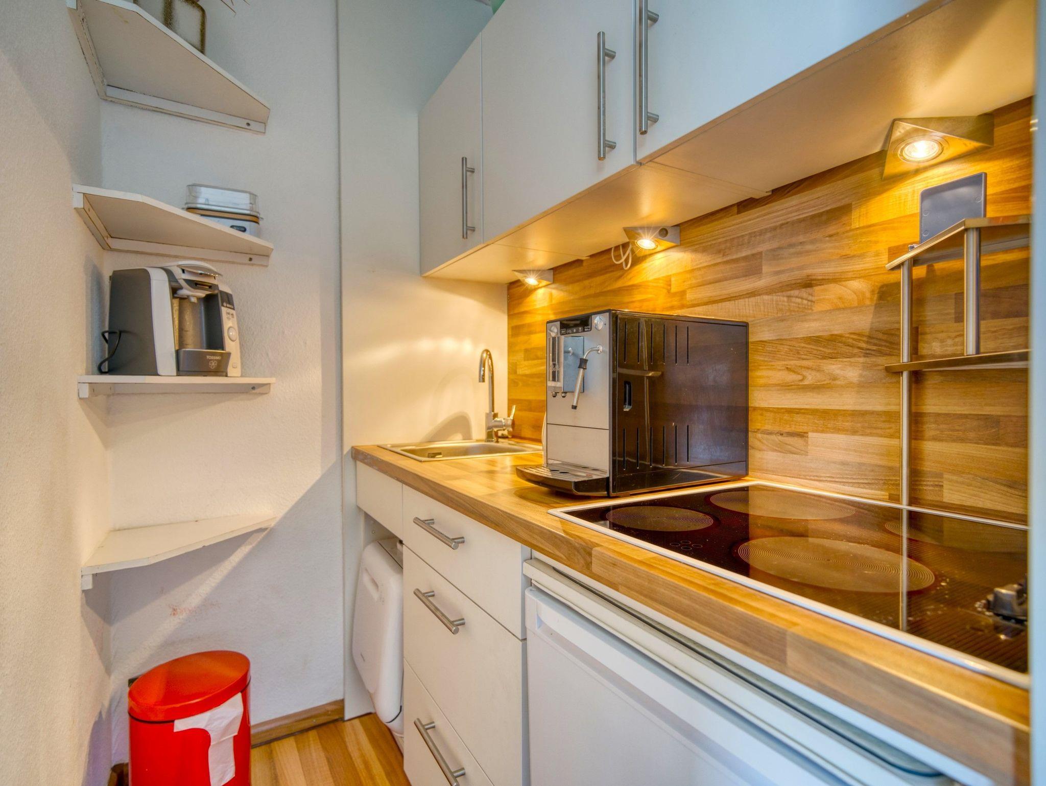 Küche mit 4-Plattenherd, Kühlschrank und Geschirrspüler