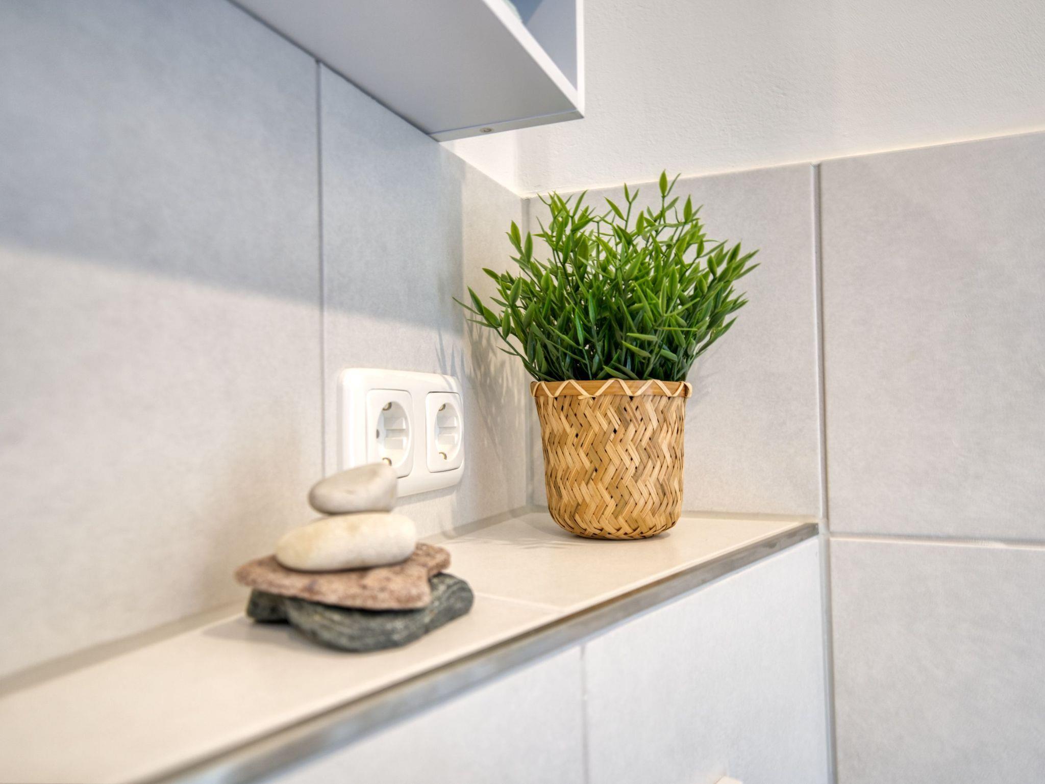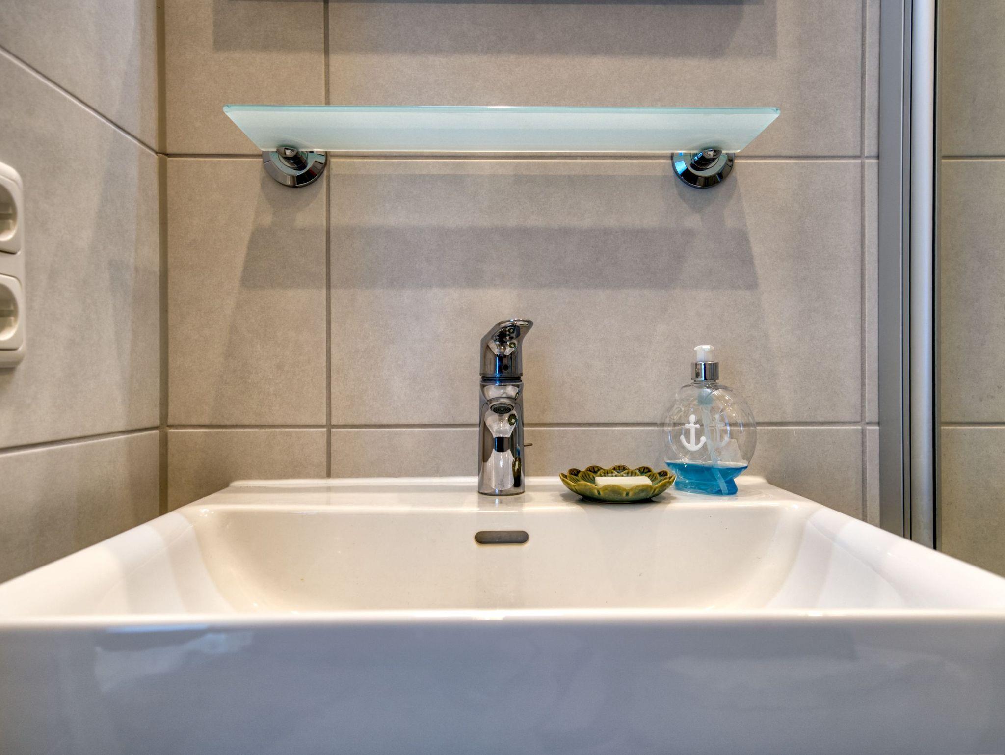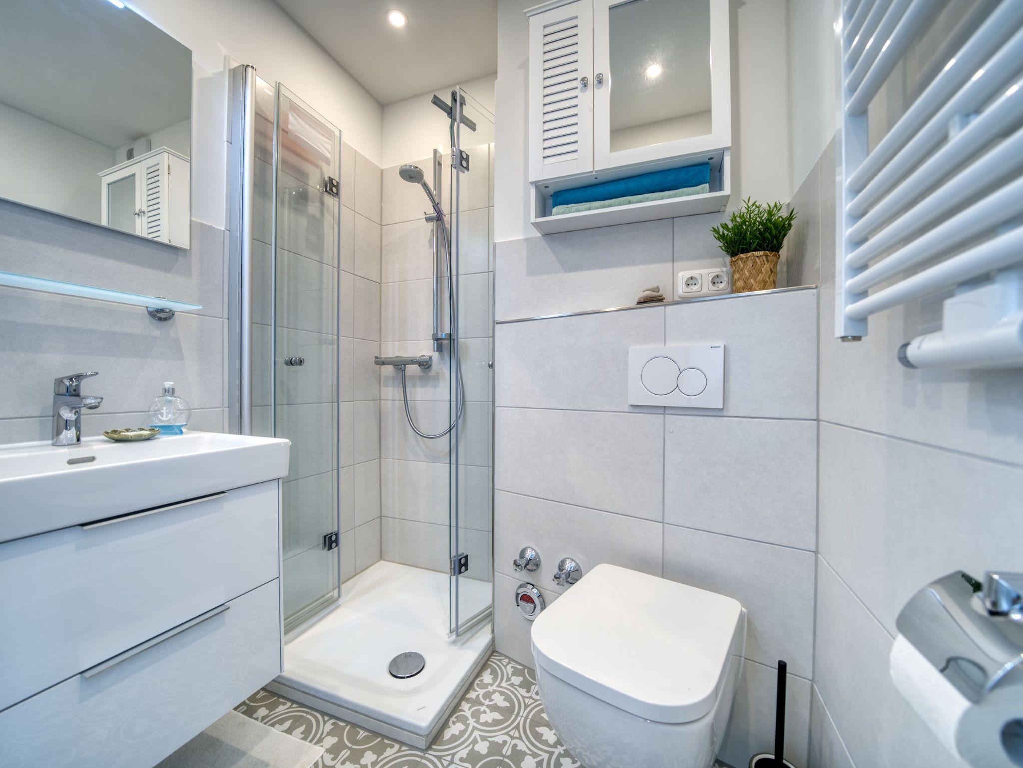 Badezimmer mit Duschkabine (niedriger Einstieg), Handtuchtrockner, viel Stauraum und Waschtisch