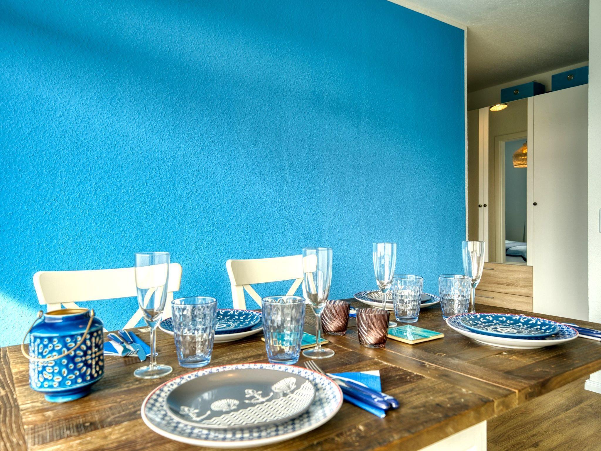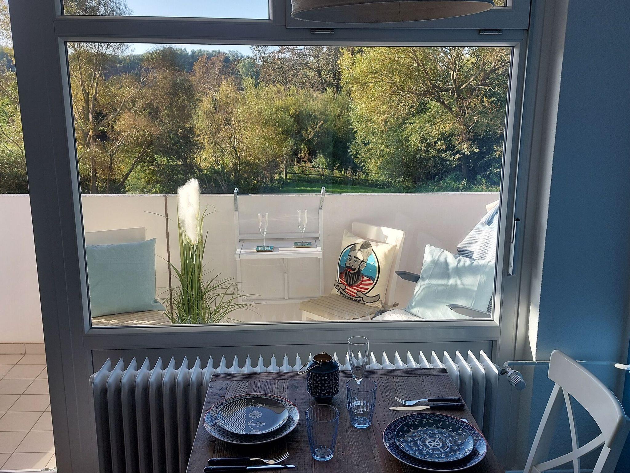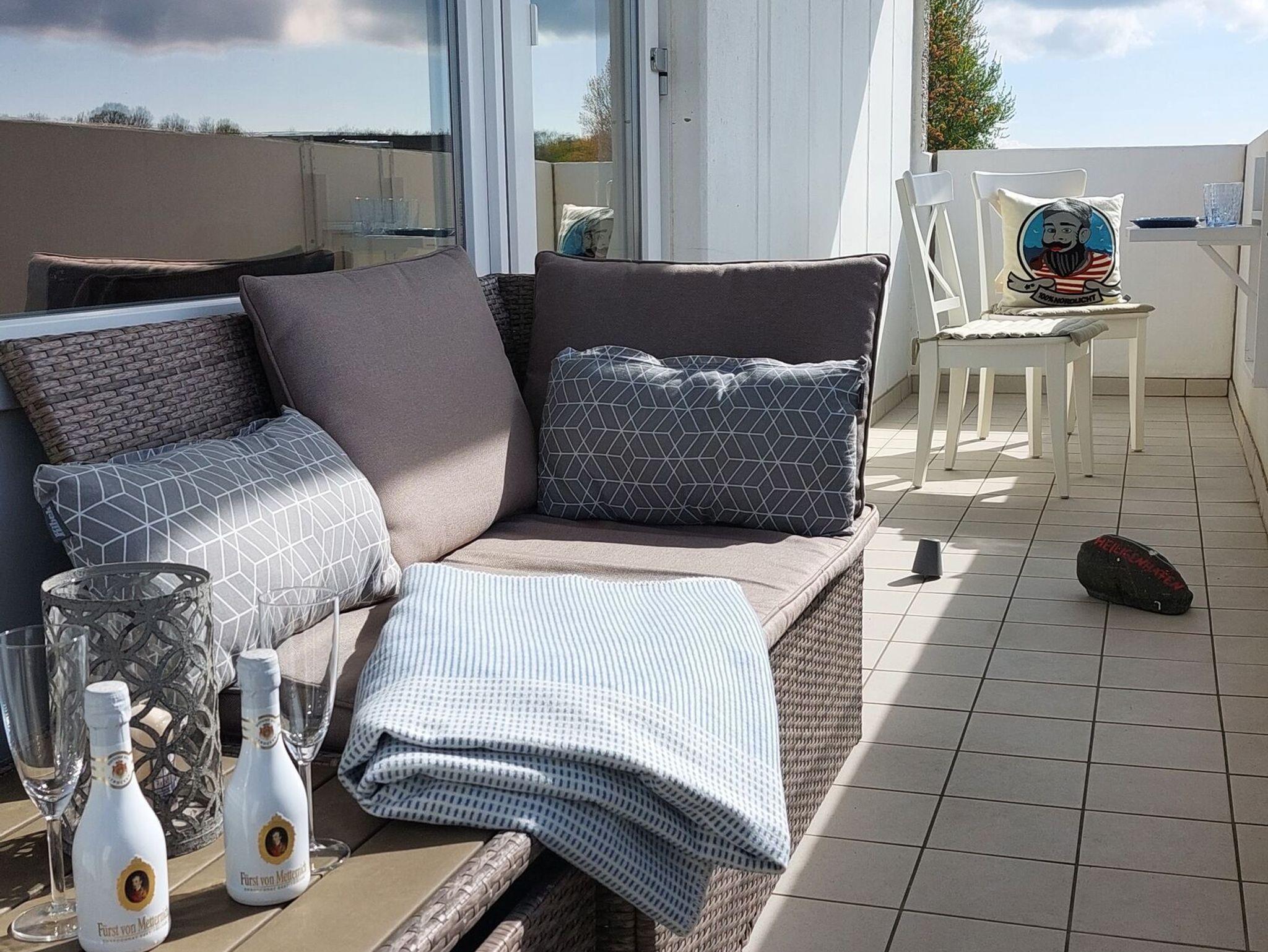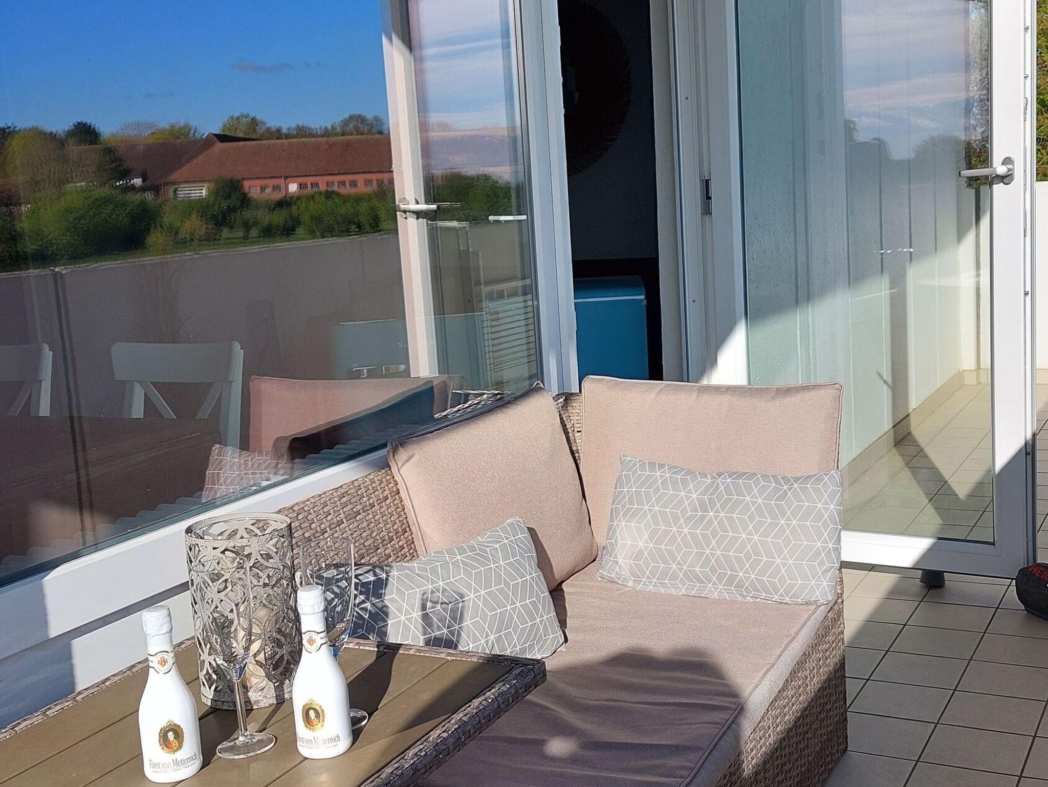 Stilvolle Ferienwohnung mit großem Balkon und Blick auf Salzwiesen im Ferienpark Heiligenhafen.