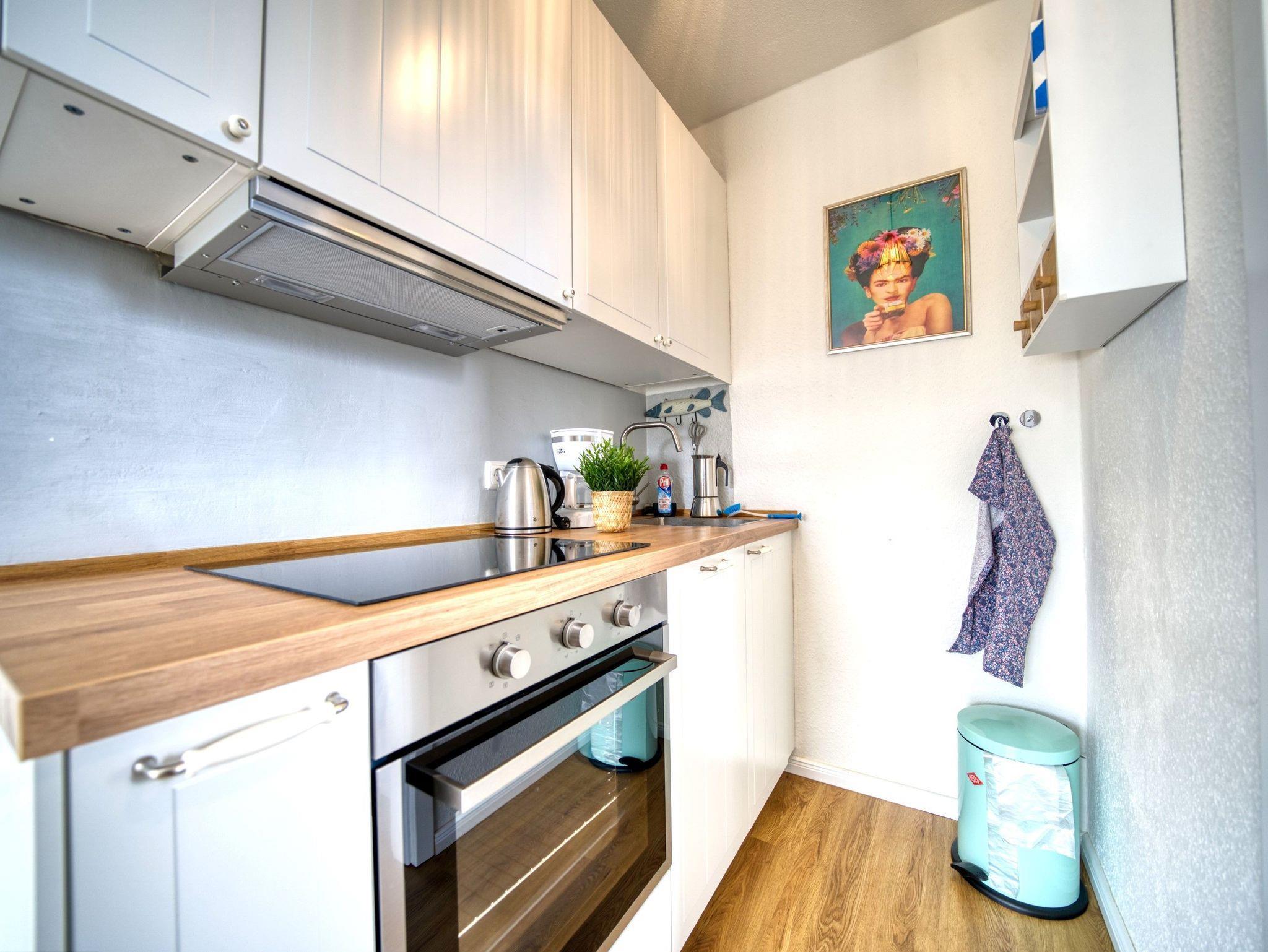 Moderne Küche mit Induktionsherd, Backofen, Geschirrspüler, Kühlschrank mit Gefrierfach und weiteren Extras