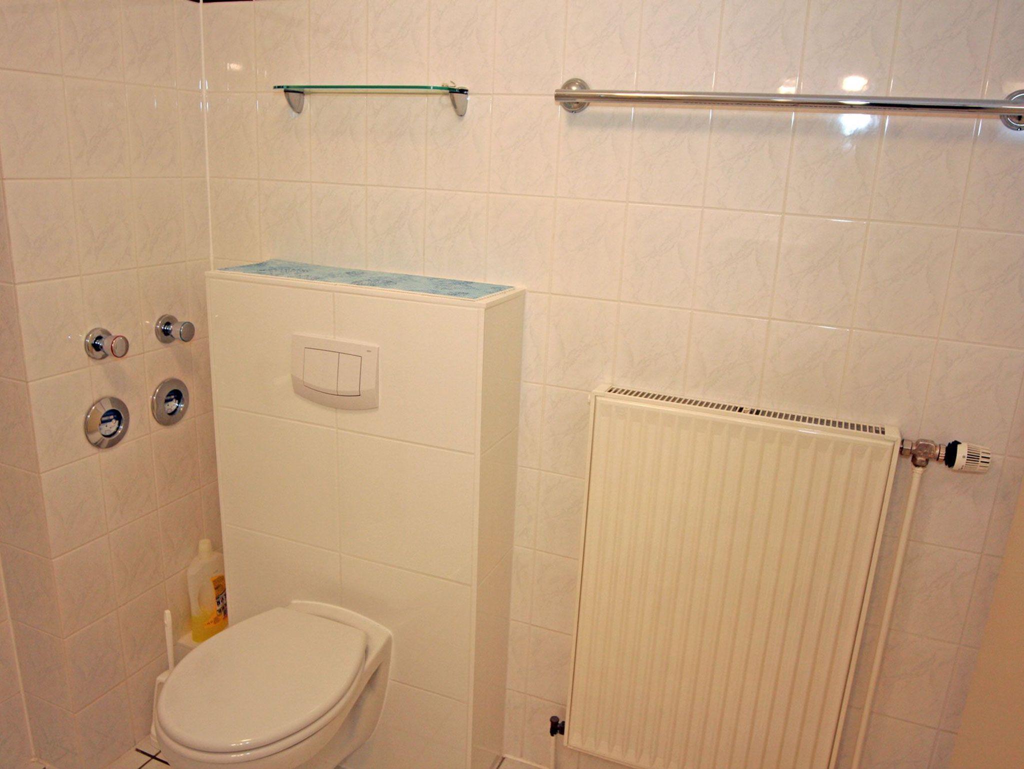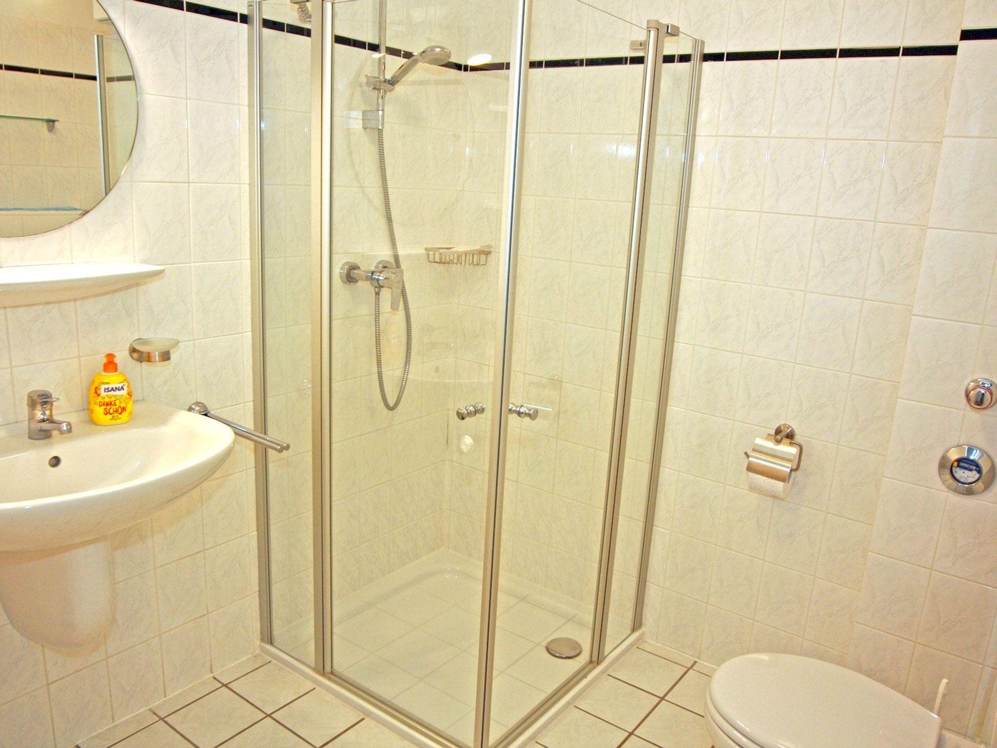 Das helle, moderne Duschbad verfügt über einen Föhn, einen Spiegel und eine Heizung zum Handtuchwärmen, sodass zusätzlicher Komfort gewährleistet ist. Pflegeleichte Böden sorgen für eine angenehme Wohnatmosphäre.