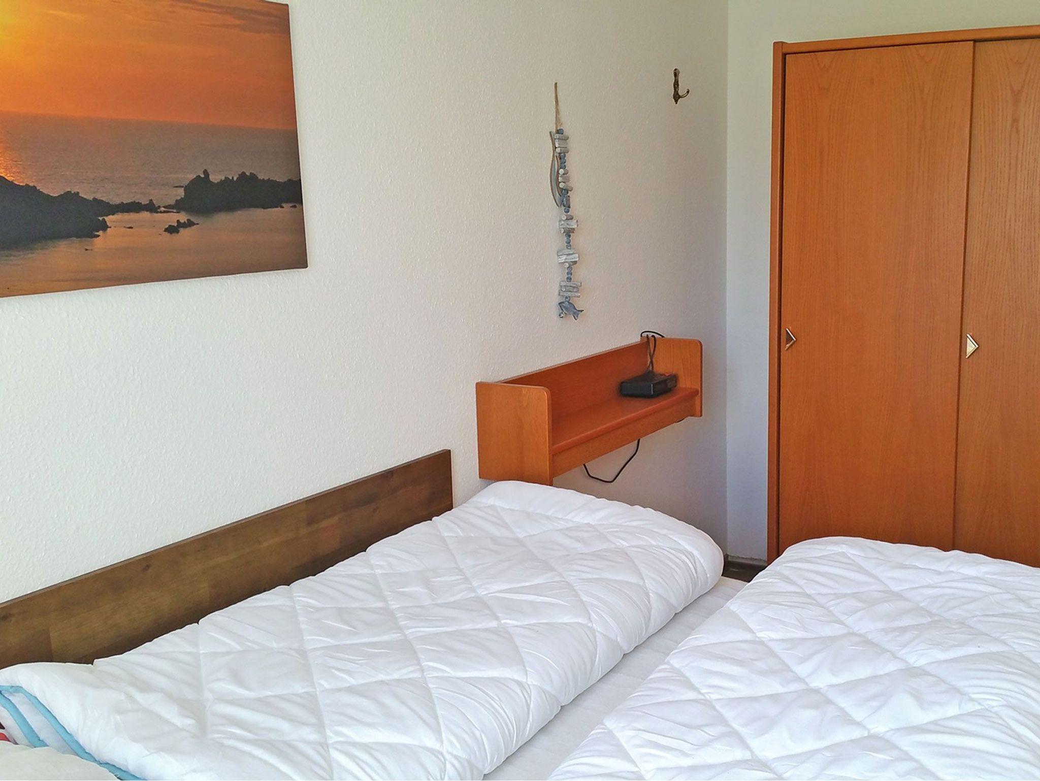 Das Apartment 8 im ersten Obergeschoss bietet auf etwa 40 Quadratmetern ausreichend Platz für bis zu vier Personen, ideal für zwei Erwachsene und zwei Kinder. Das Schlafzimmer ist mit einem 1,60 Meter breiten Doppelbett und einem großen Kleiderschrank ausgestattet. Eine großzügige Schlafcouch im Wohnbereich bietet zwei weiteren Personen eine komfortable Schlafmöglichkeit.